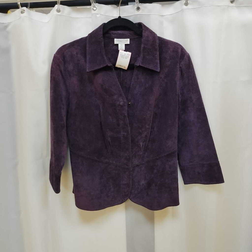 3/4 sleeve snap front , waist length with slight peplum , slight pleating