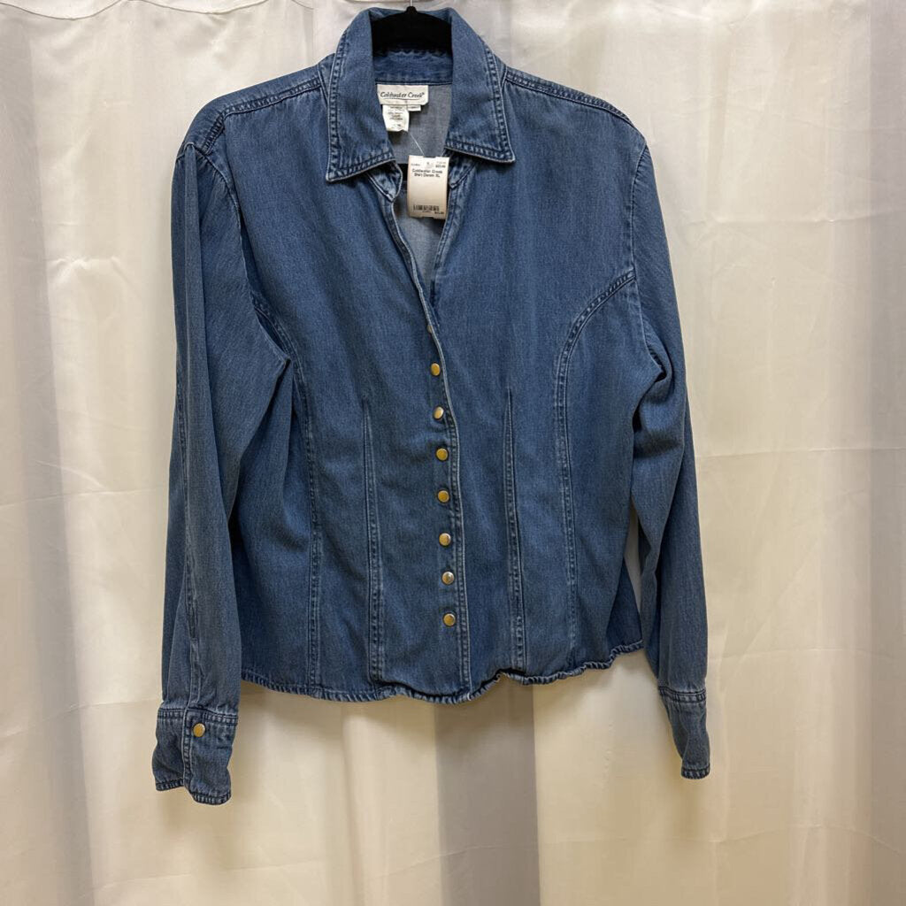 Long sleeve fitted snap front denim shirt with collar and cuffs.