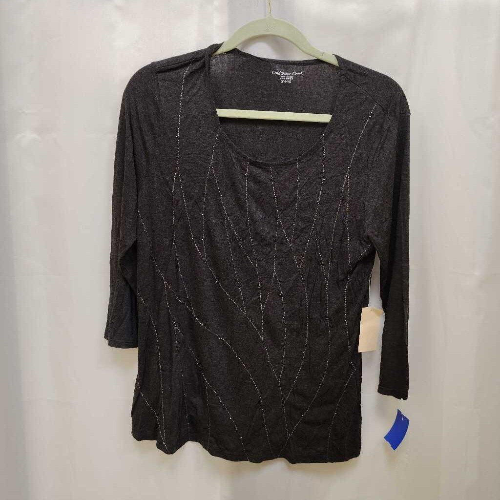 Long sleeve pullover , new with tags , gold metallic stitching with gray round beads