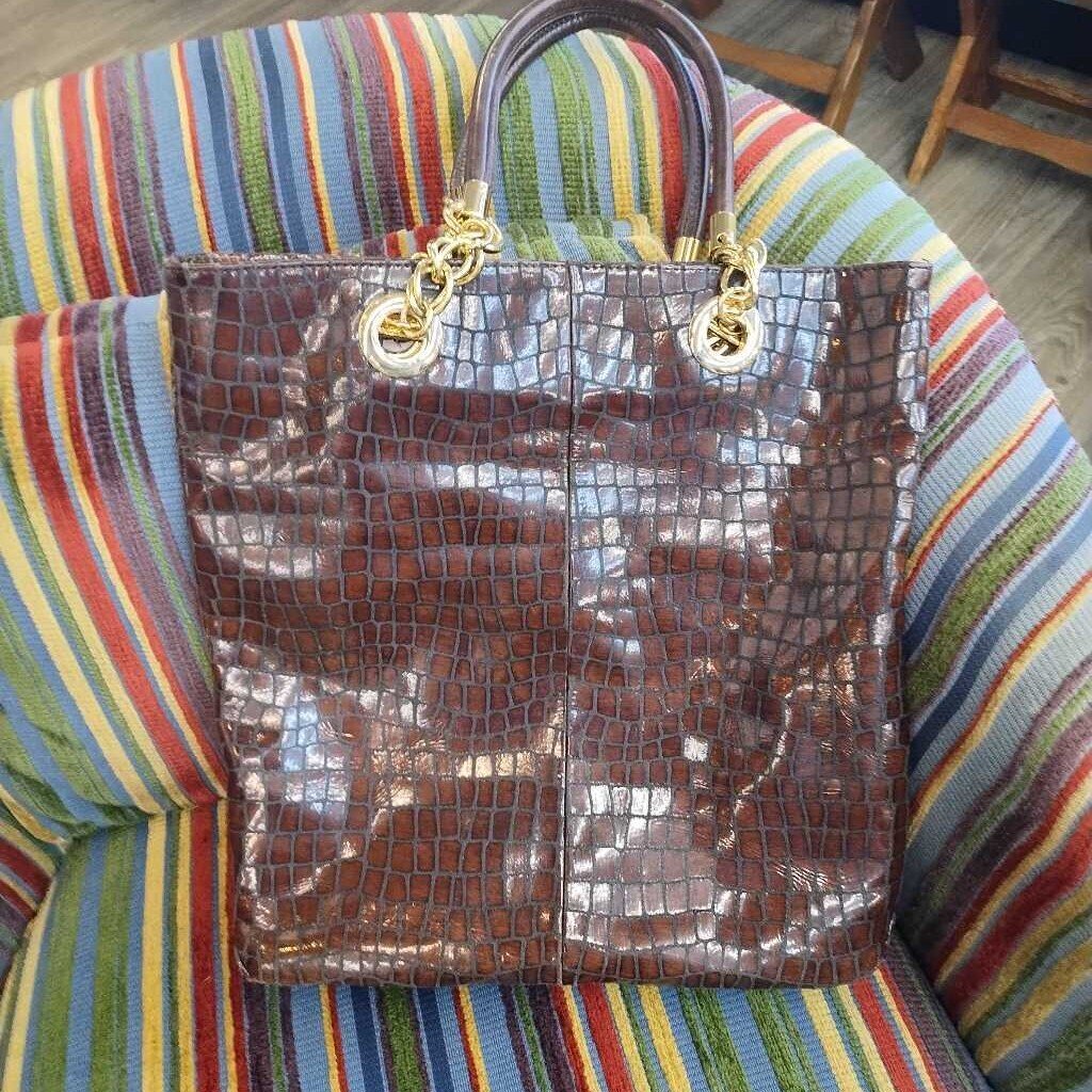Large brown textured leather tote bag with goldtone hardwear and dust bag inside.