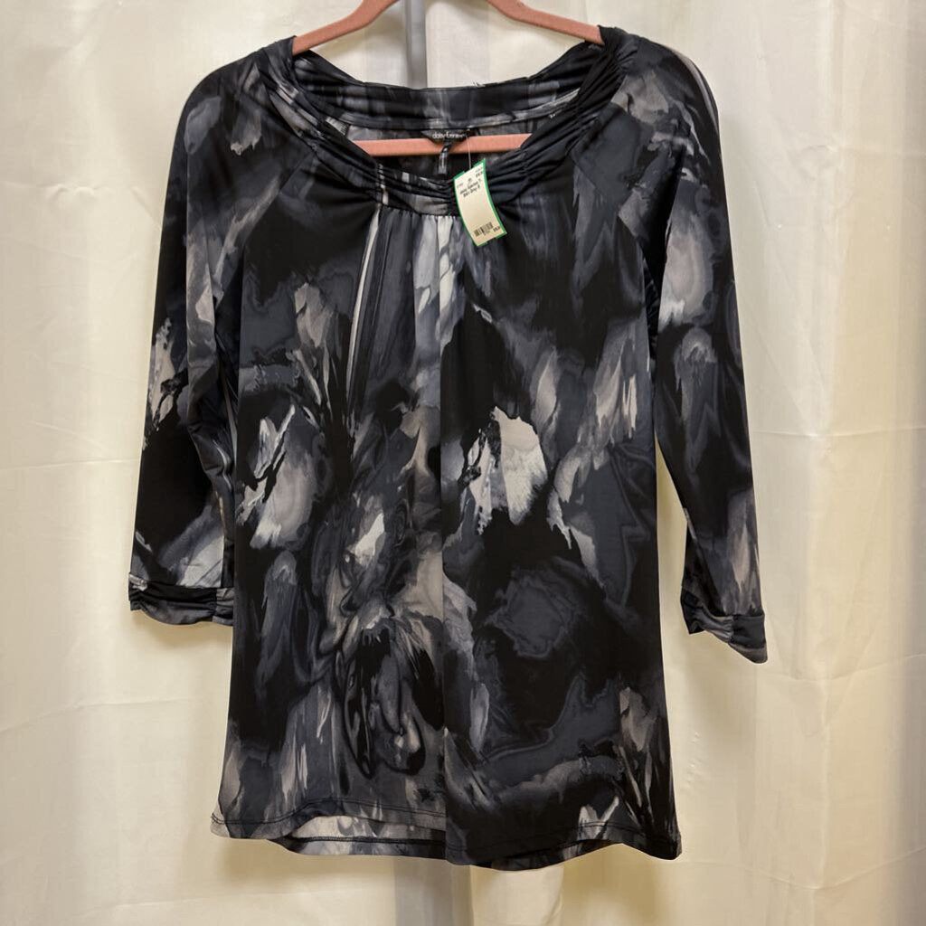 3/4 sleeve abstract oil slick floral printed knit pull over t- shirt with novelty shirred neckline.