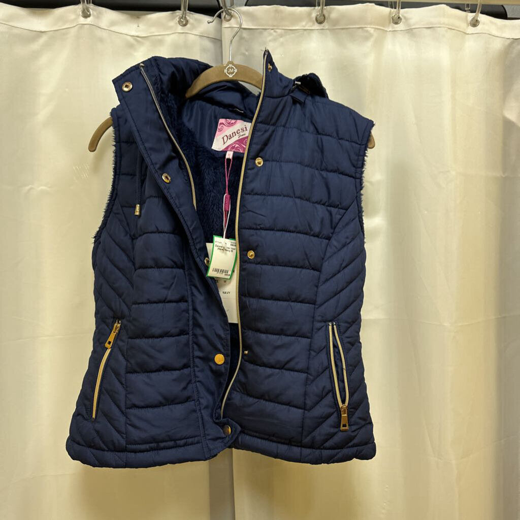 New w/tag: Hood, no sleeves, snap and zipper closure, side pockets with zippers. Falls past waist.