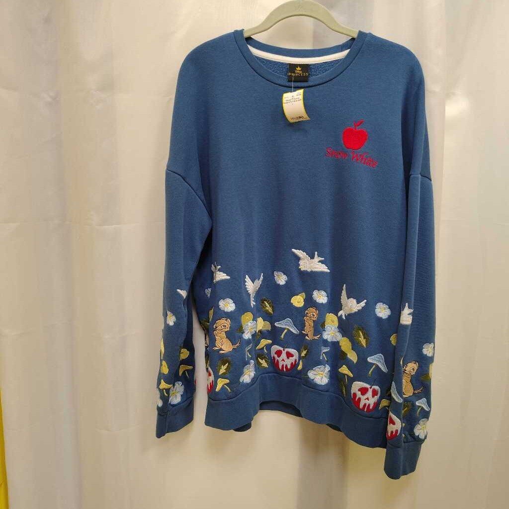 Blue with Snow White and apple in red. Animals and flowers around bottom