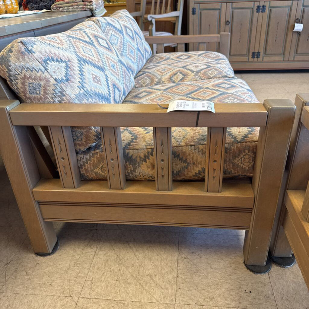 19" at cushion; mission style box frame; multi colored chevron southwest print upholstery painted and carved accents