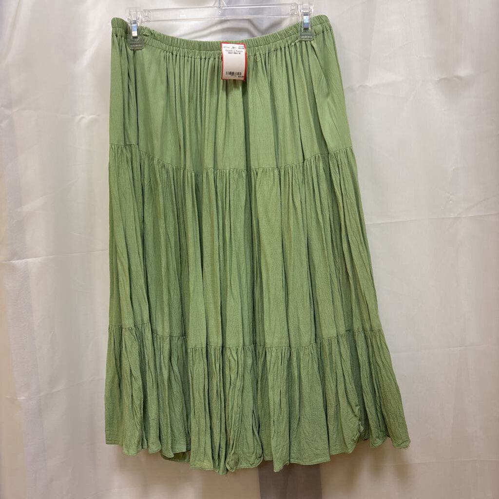 Below the knee broomstick pleated skirt with elastic pull on waistband.