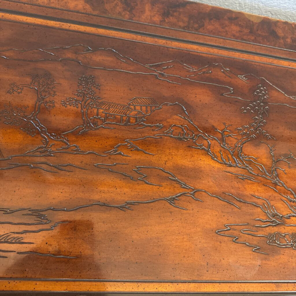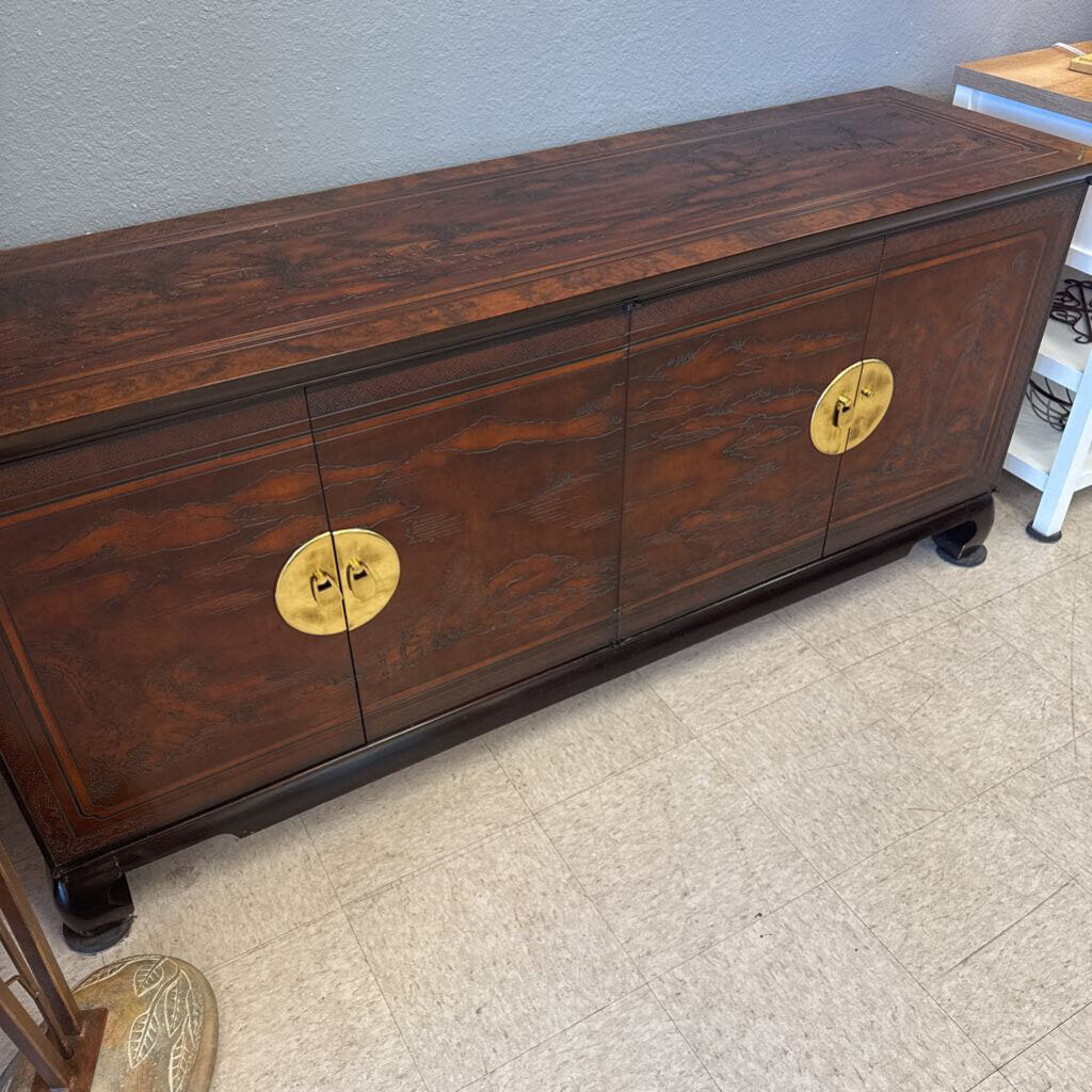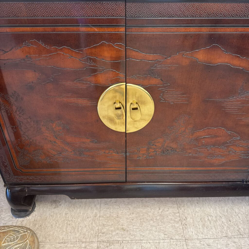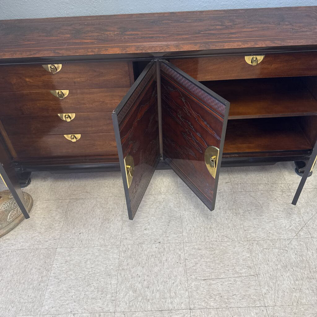 walnut, mahogany & burl wood; top is carved with Oriental Inspired Landscape; brass accents by metal pulls; one pull is missing pin but included for future repair; two sets of double doors cover storage; left side has 3 drawers; right side has adjustable shelf and flatware drawer