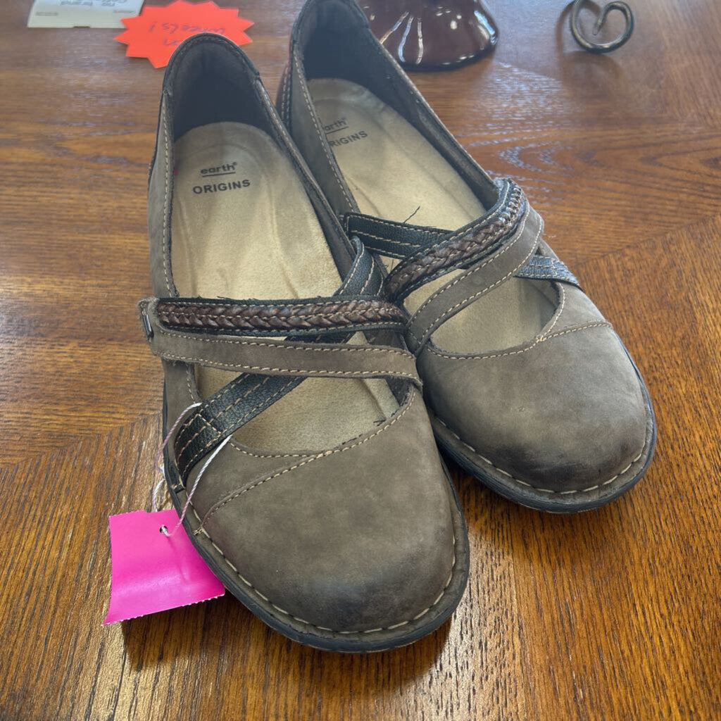 Brown leather flat Mary Jane shoes with strappy velcro closures.
