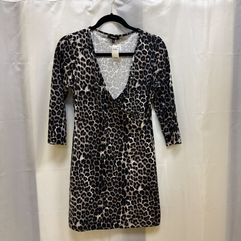 3/4 sleeve animal printed pull over knit short dress with wrap neckline.