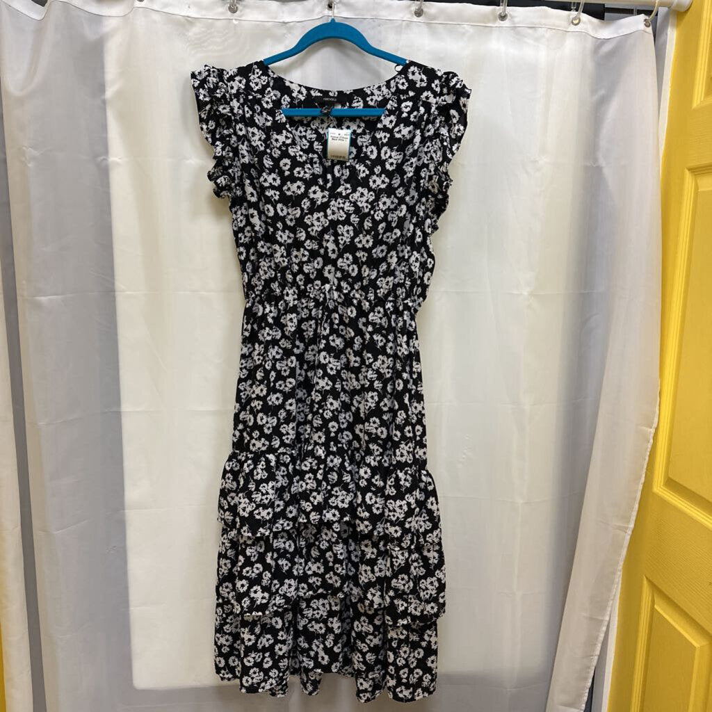 Ruffle cap sleeve floral printed pull over dress with V- neck, elastic tie waistline and ruffle bottom.