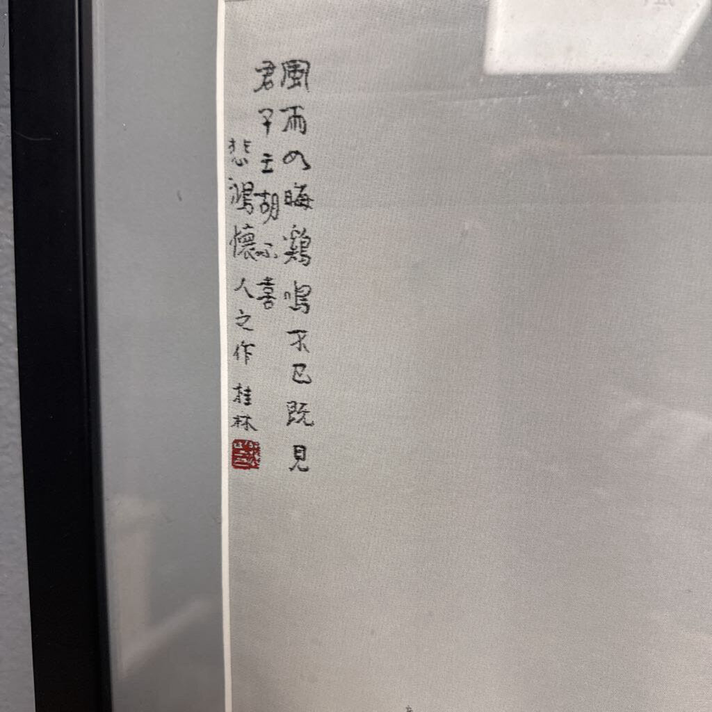 "Rooster crows in wind and rain"; professionally framed; chinese calligraphy on top left edge
