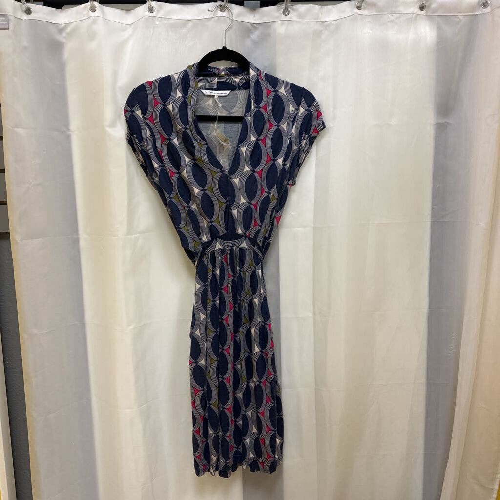 Cap sleeve mod oval print knit pull over short dress with V- neck, side pockets, and back tie.