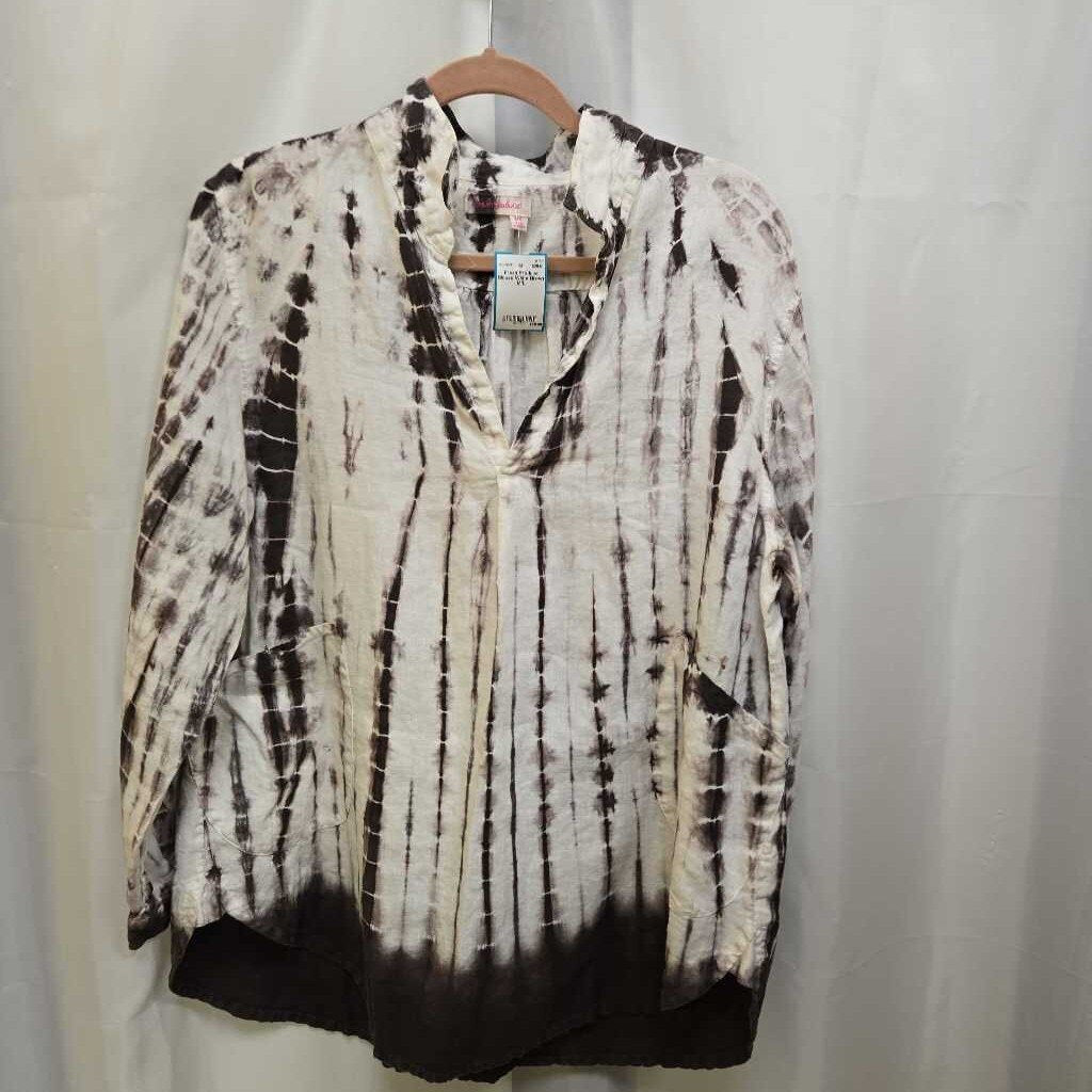 Long sleeve tie dye printed linen pull over blouse with large round patch pockets.