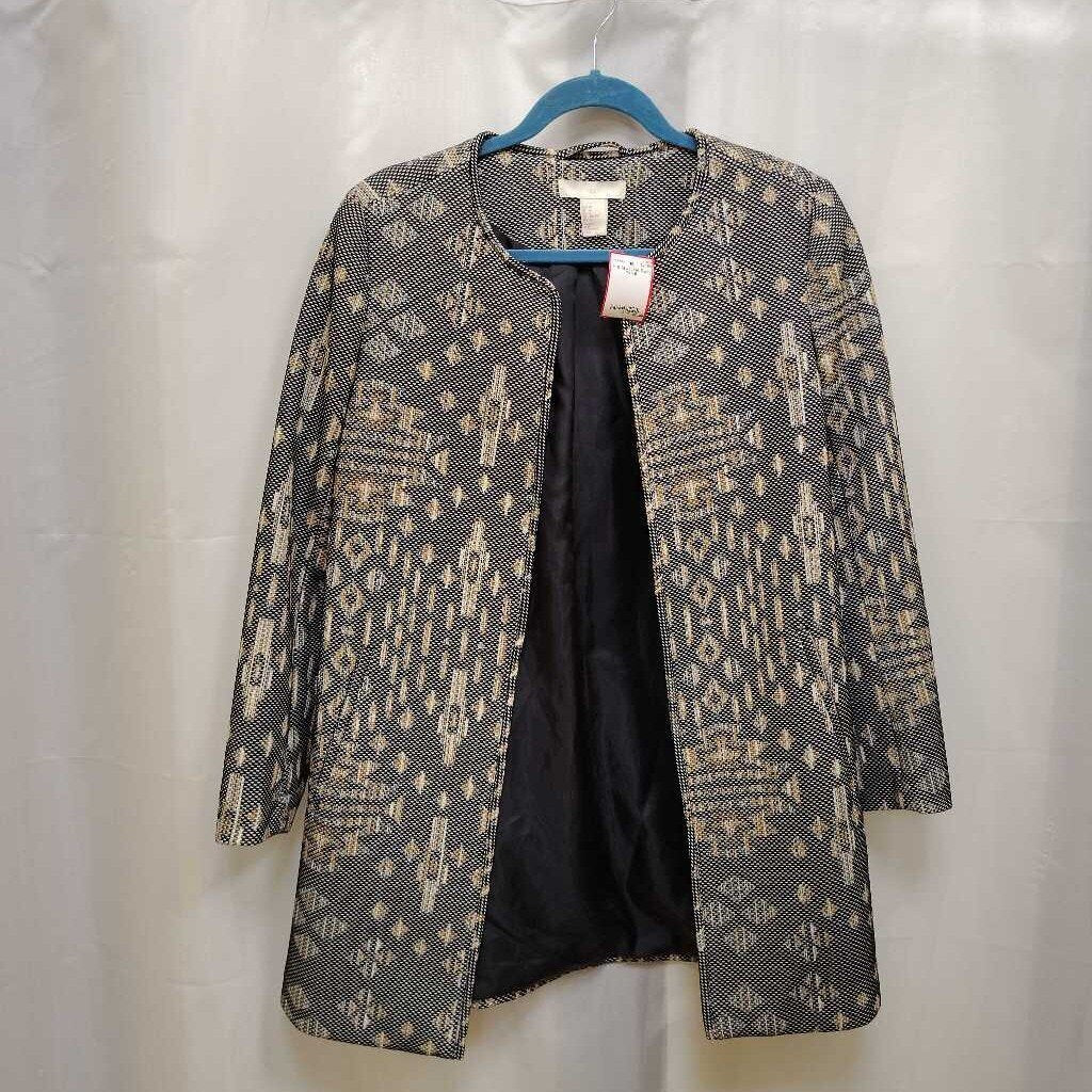 Long sleeve long pull on Southwestern jacquard printed open jacket with welt pockets and no collar.