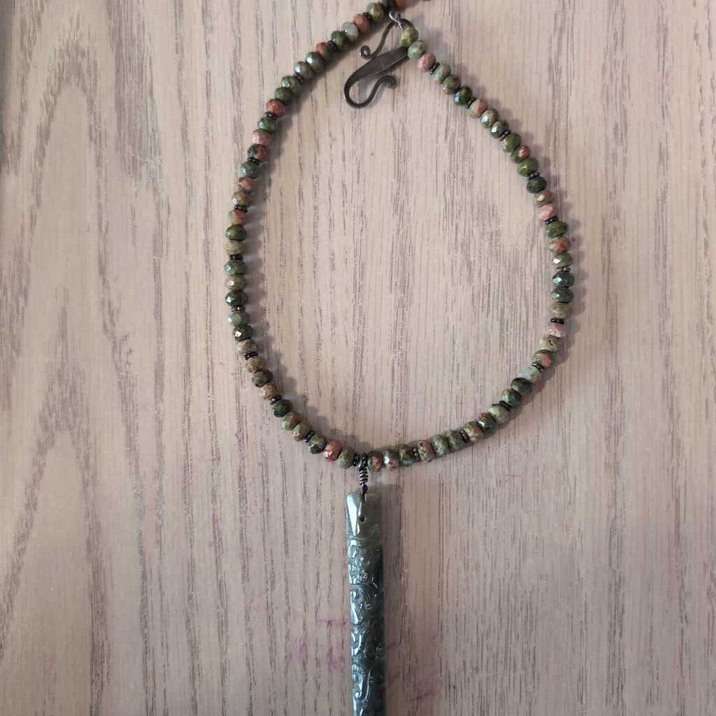 Faceted Beads w/925 Spacers w/Hand-carved Long Thin Pendant