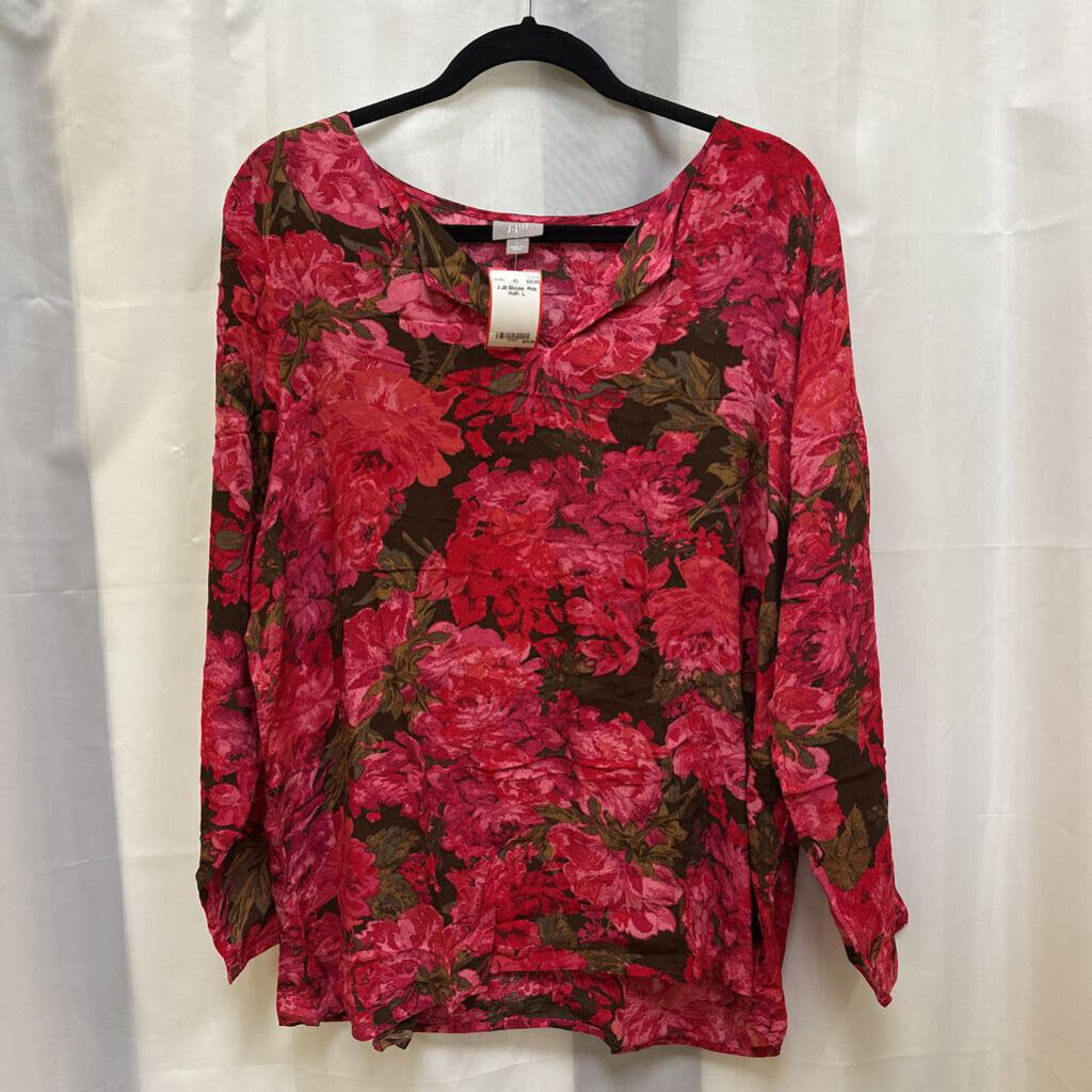 Long sleeve v neck pullover. Pink, red, brown floral pattern.