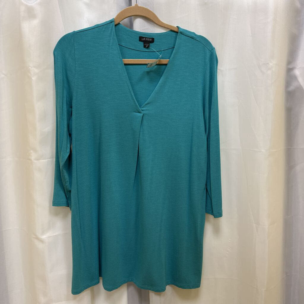 3/4 sleeve solid knit pull over tee with V- tucked neckline.