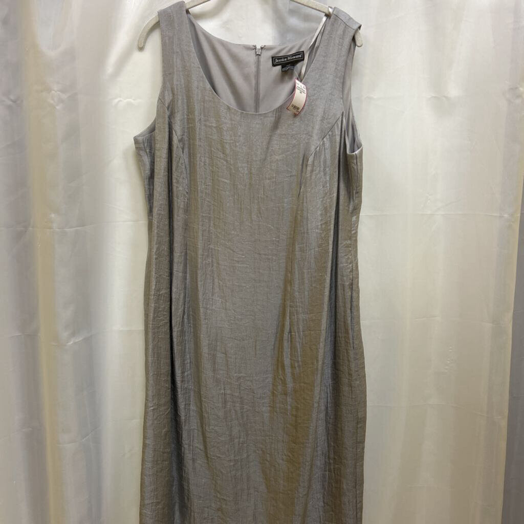 Sleeveless straight sheath dress with scoop neckline in silver metallic with back zipper closure.