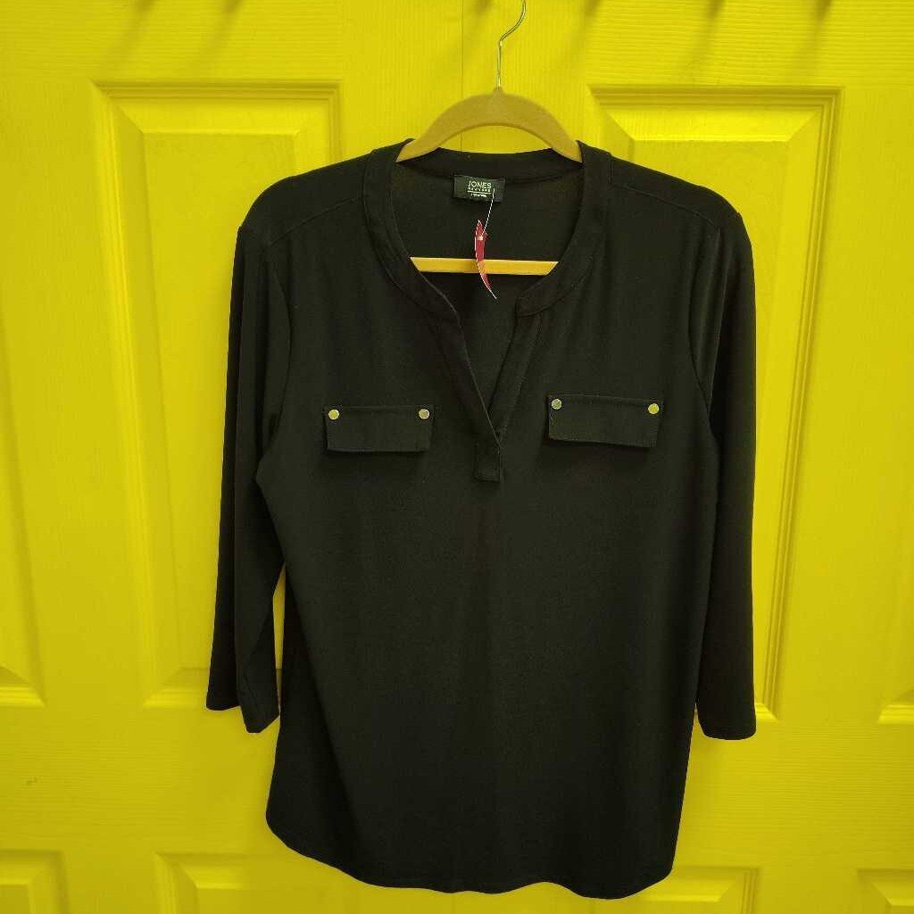 Long sleeves, pull on, faux front pockets, falls past waist.