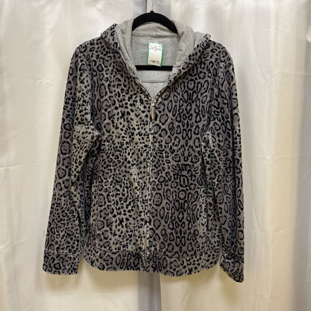 Long sleeve animal print zip front cardigan hoodie with front welt pockets.