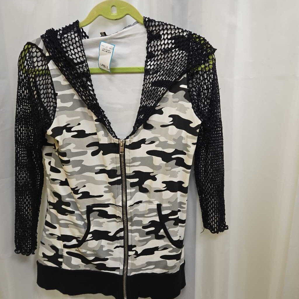 Camo print zip front hoodie with kangaroo pockets and contrast black open mesh 3/4 sleeves and hood.