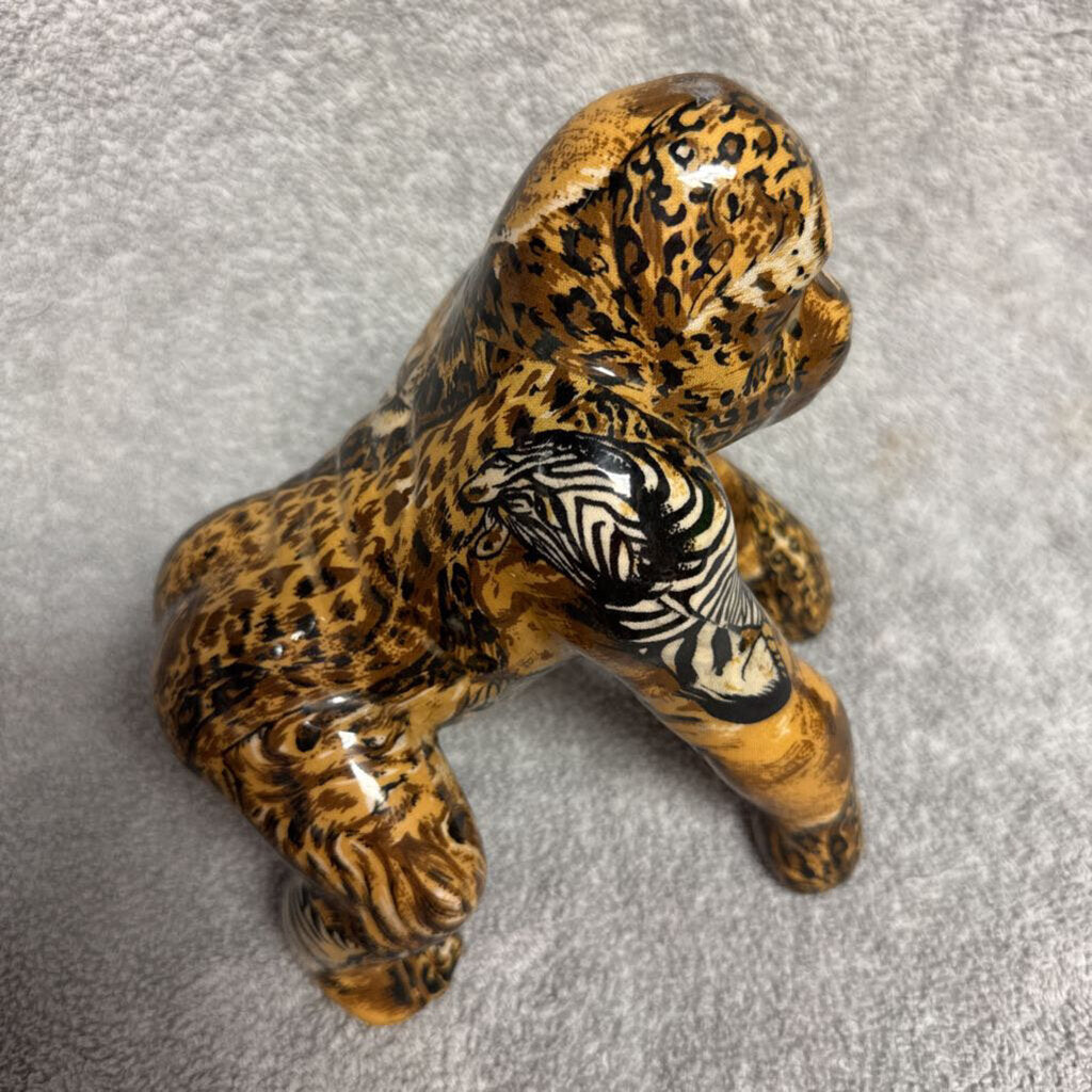 safari collection; ceramic gorilla; high glaze; looks decoupaged in various animal prints