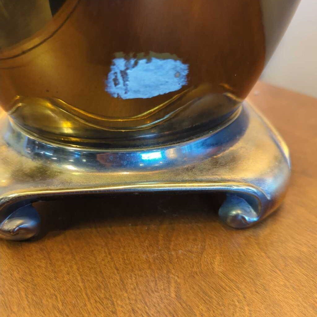 Gold tone ceramic base with large tapered shade. There is some paper stuck to the side of the base.