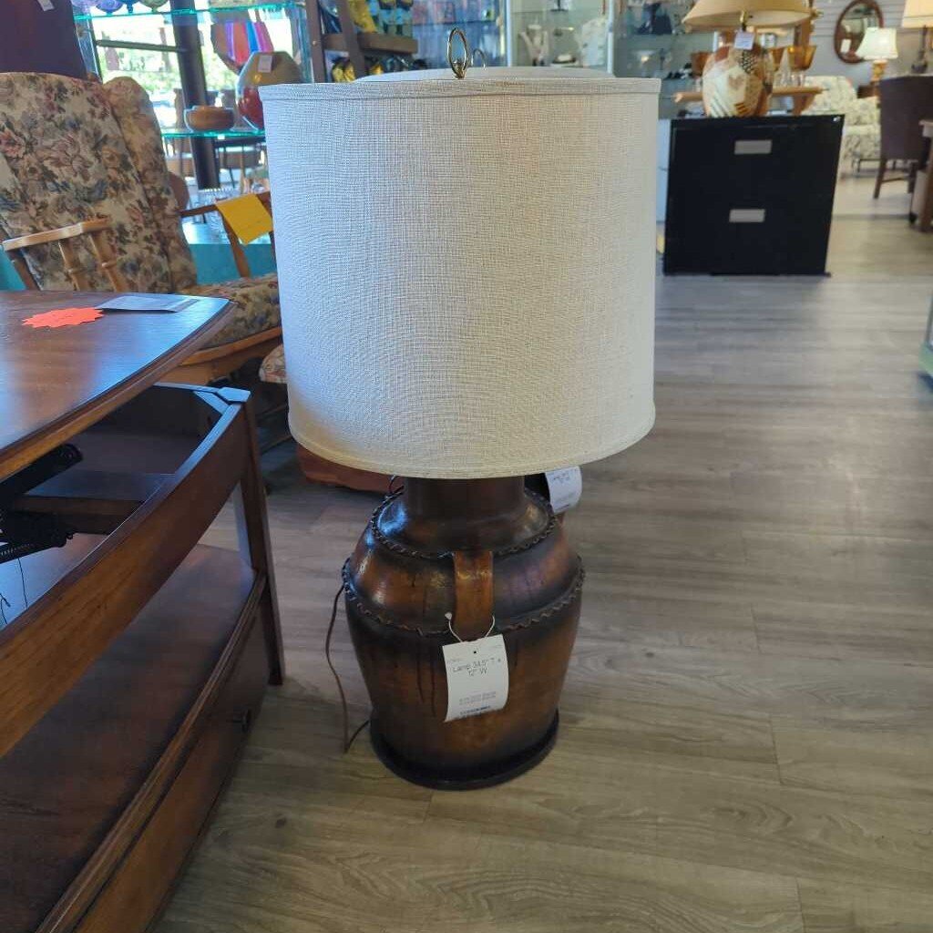 Brown pottery bottom with jug like shape, has handles on sides. Shade is 15" T and 17.5" diameter.