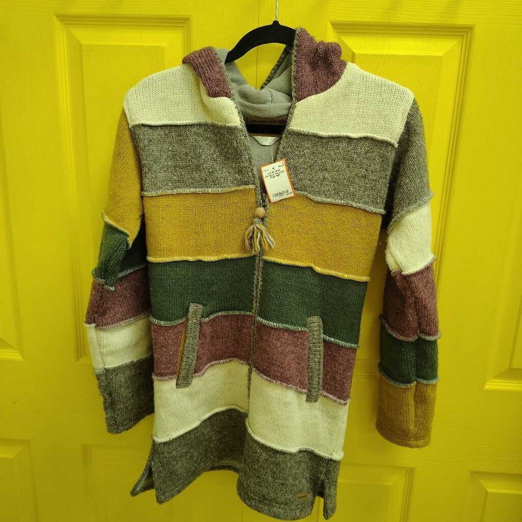 Long sleeve wool patchwork zip front cardigan sweater with hood, front welt pockets, and outside seaming details.