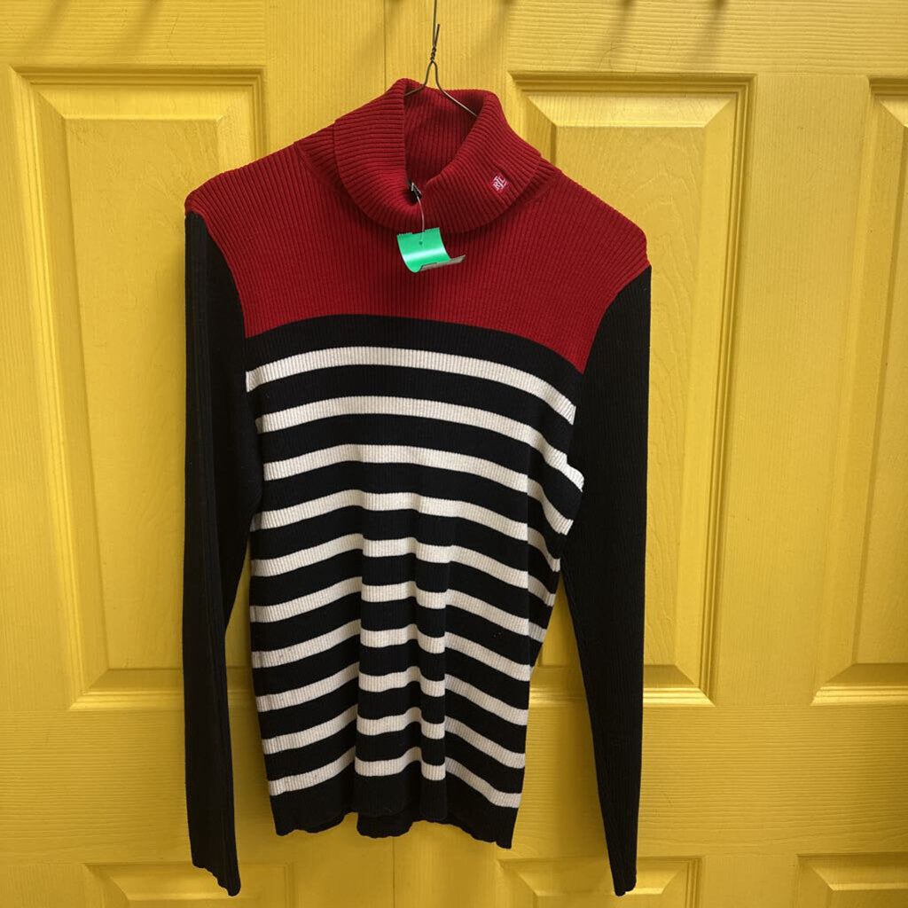 Long sleeve cotton rib knitted pull over sweater with stripe and color blocking and turtle neckline.
