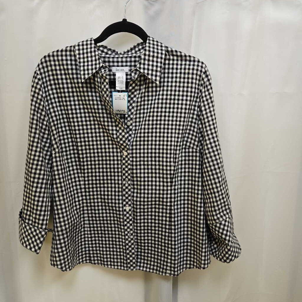 3/4 sleeve gingham check printed button down shirt with collar and wide cuffs.