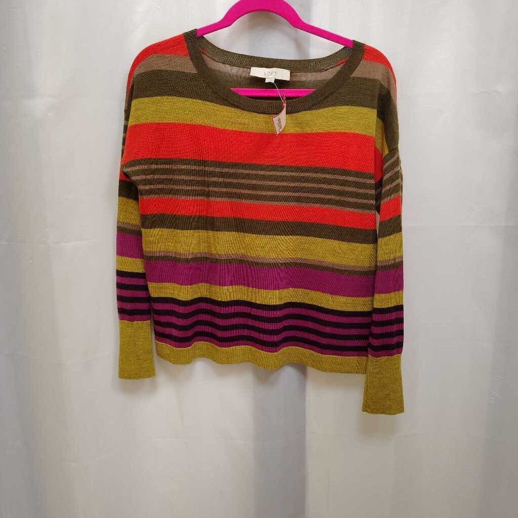 Long sleeve variegated stripe pull over knitted sweater with scoop neckline.
