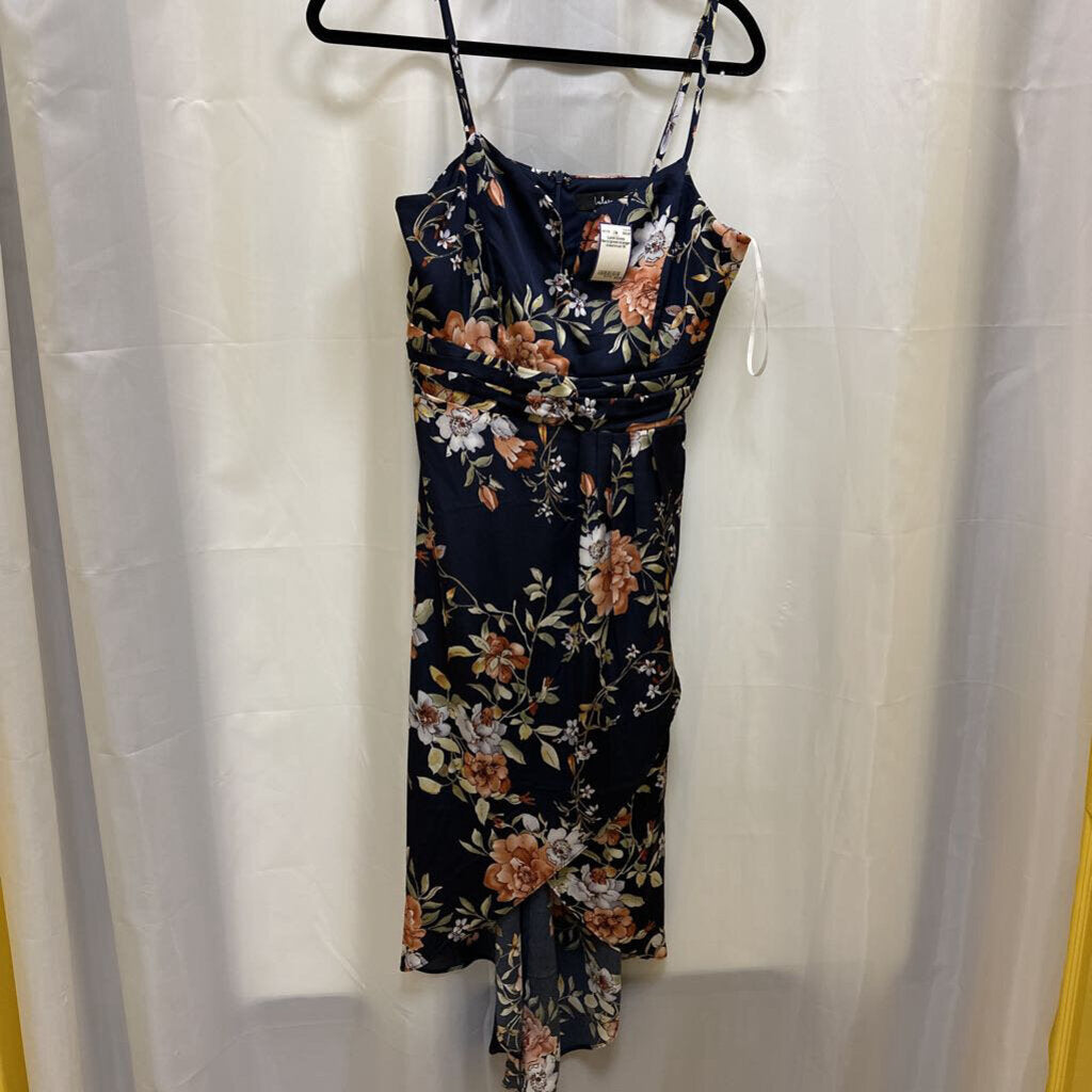 Zipper closure in back, thin straps, vneck in front. Flower design, High/low hem line. Pretty! Falls to lower shin.