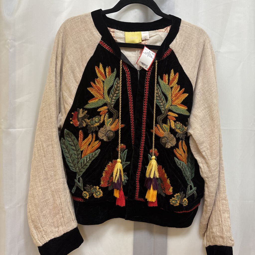 Long raglan sleeve embroidered velvet front jacket with tassel tie trim, new with tags.