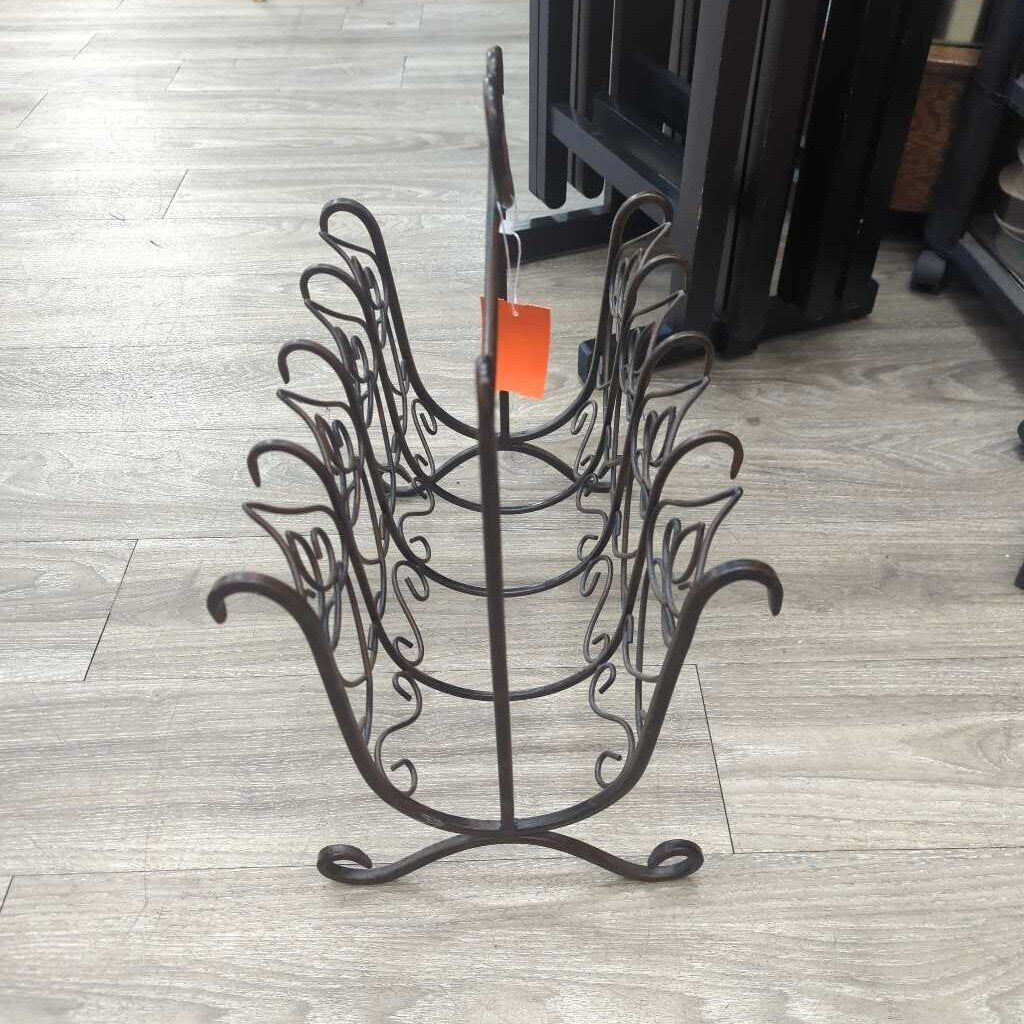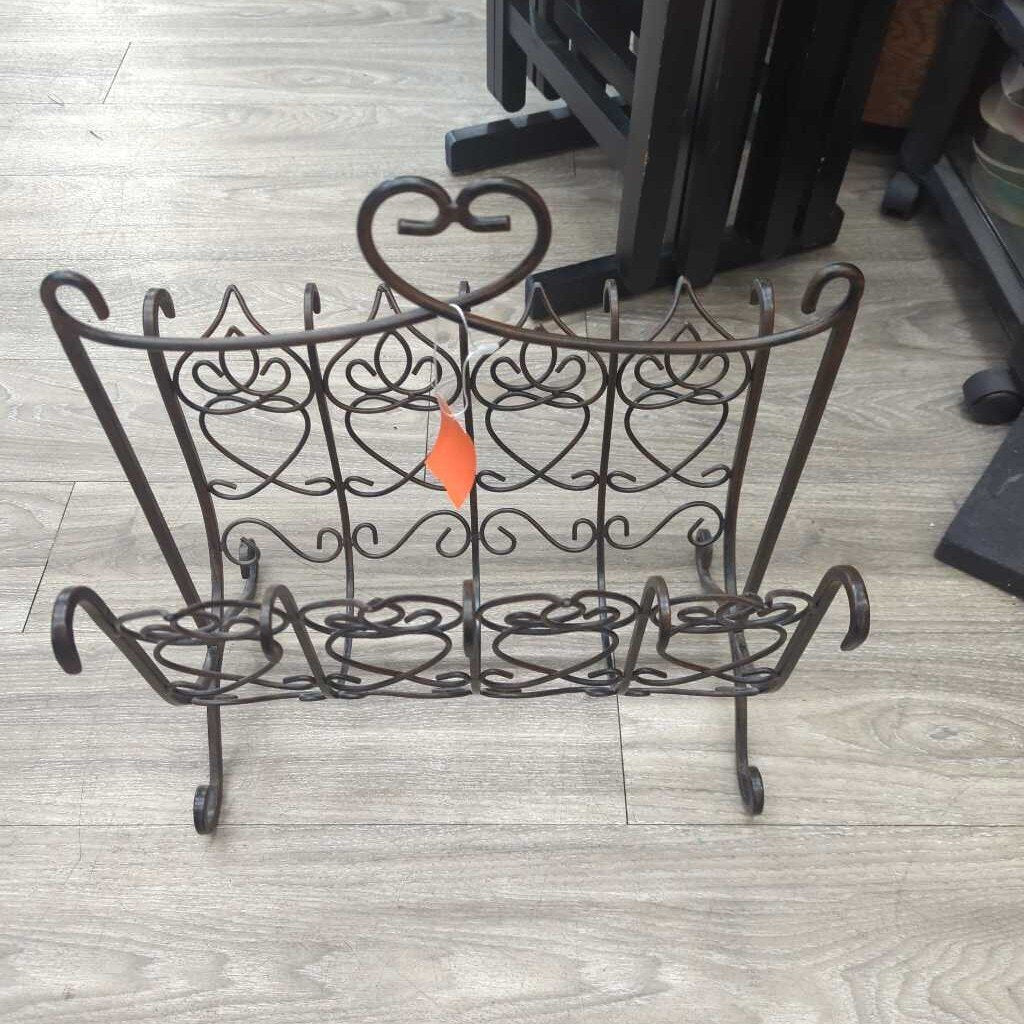 Double sided metal magazine rack with handle. The metal is wirey and has heart shapes almost like flames.