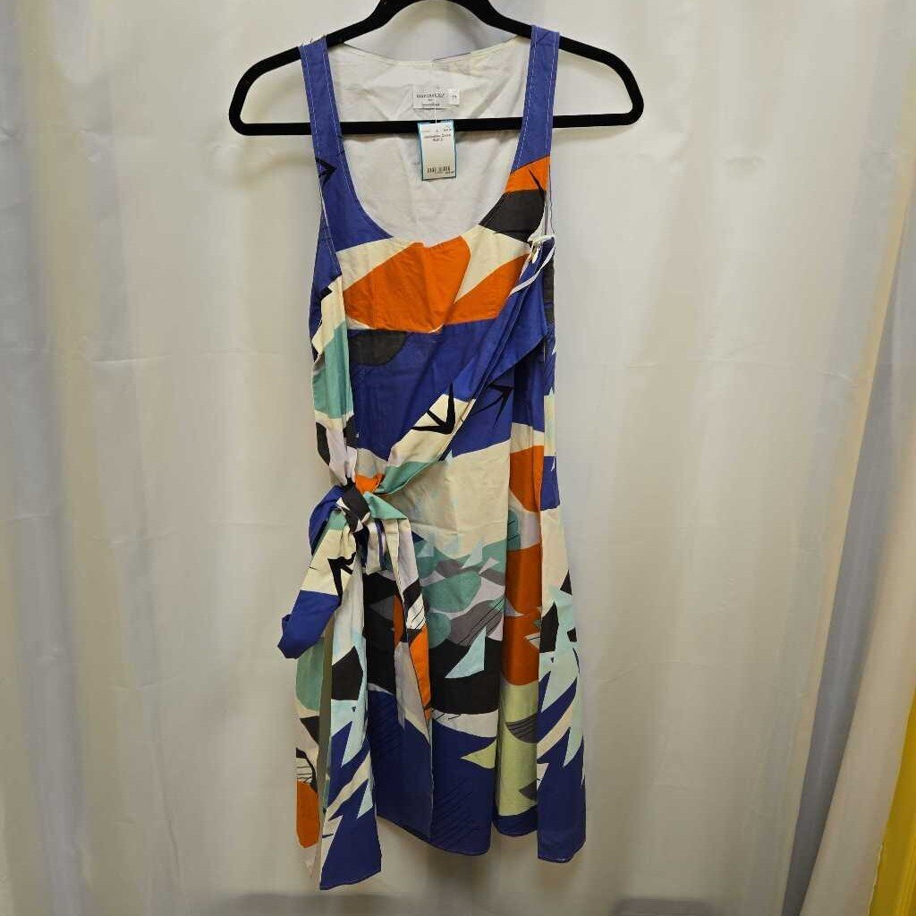 Sleeveless fit and flare abstract printed cotton dress with large self ties.
