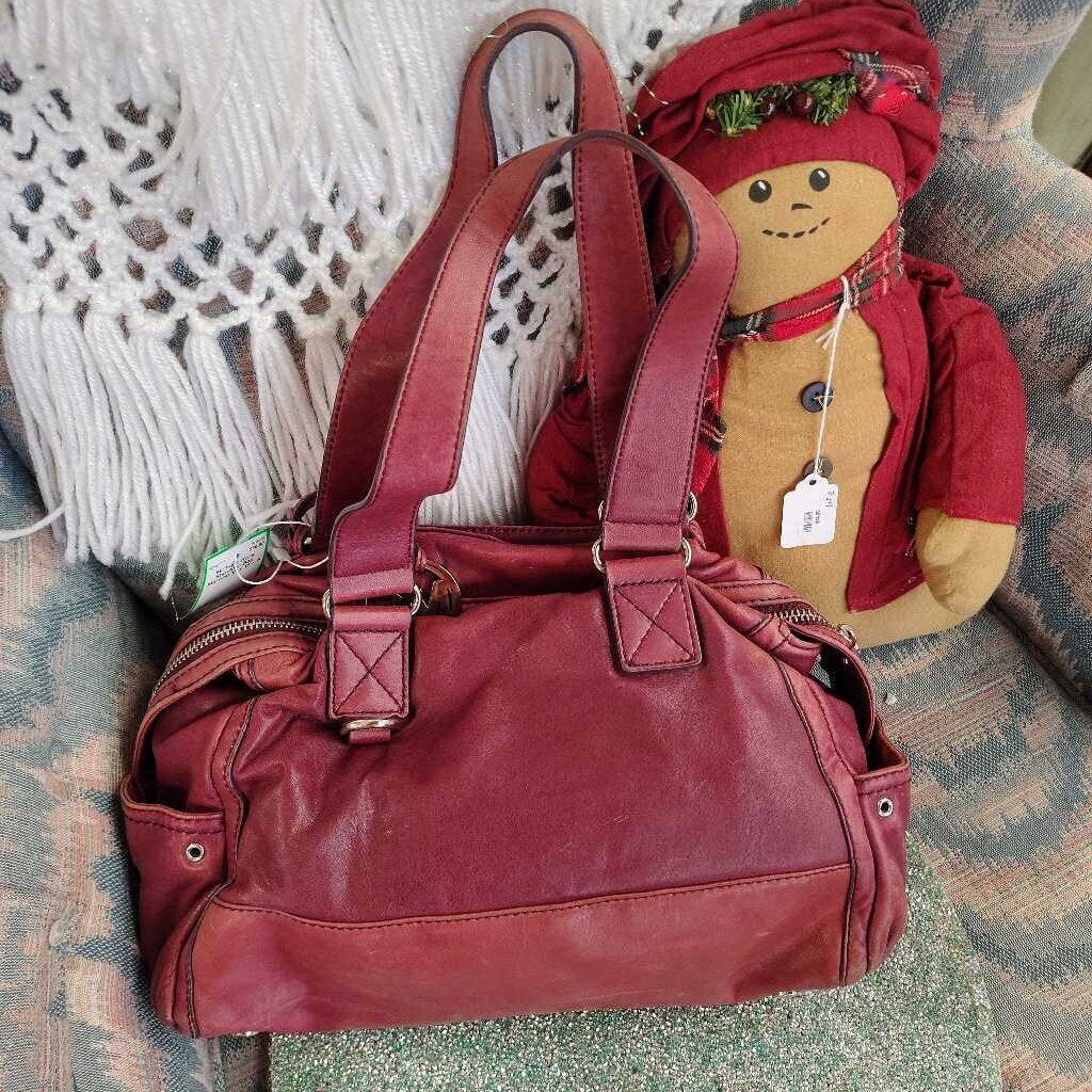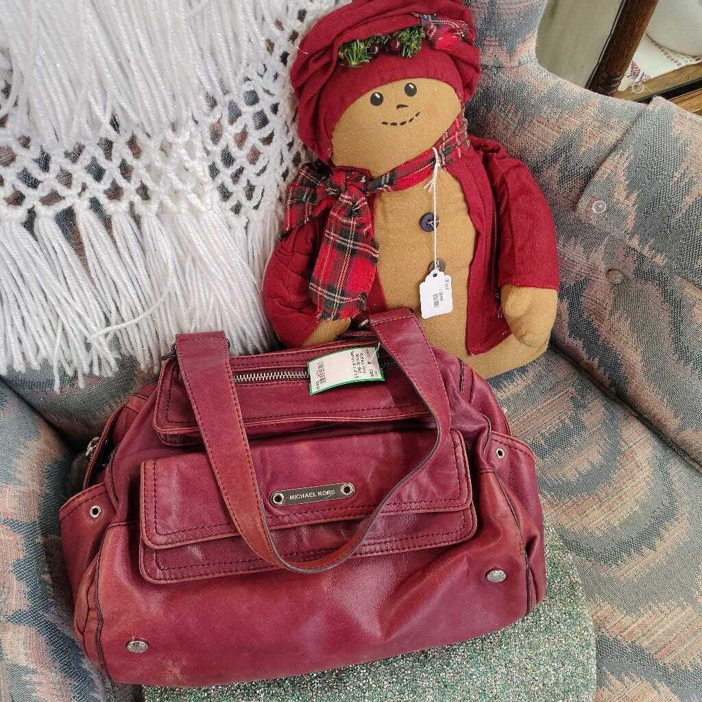 Maroon leather MK shoulder bag with silver tone hardware and top zipper closure. Bottom has a stain, and lots of wear but good "started bag", sold as is.