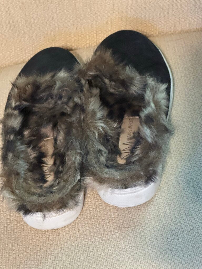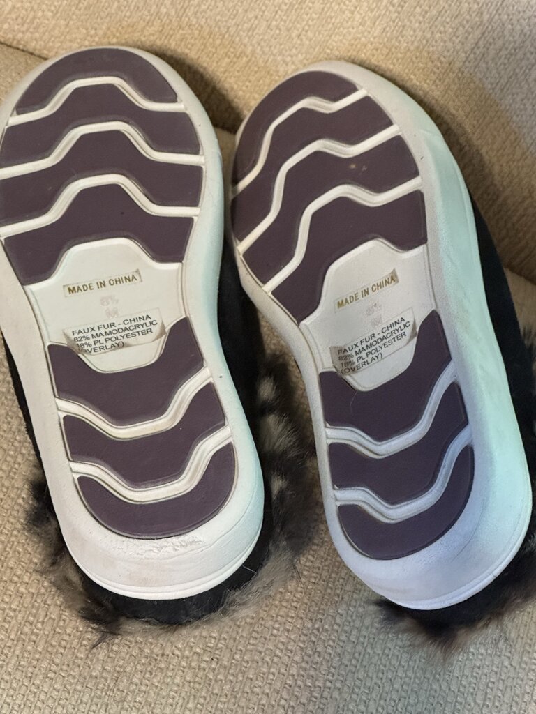 hard sole sueded upper with faux fur trim; great as slipper or casual shoe