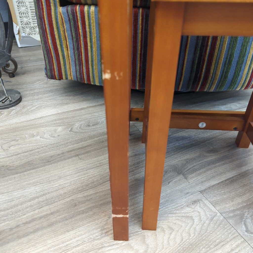 There are 2 tables the smaller one fits under the larger one. The smaller table measures 12" W x 13" D x 16" T There is some damage on the legs.