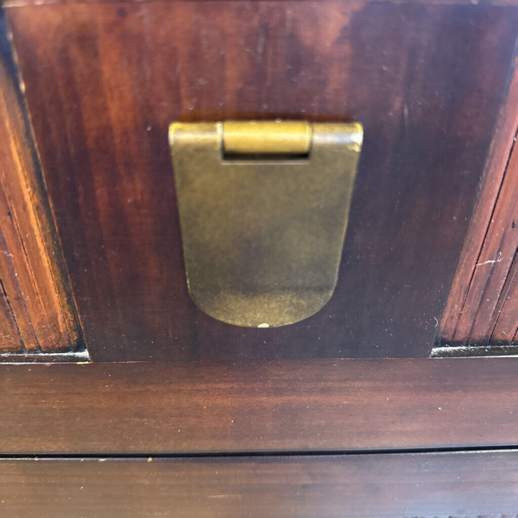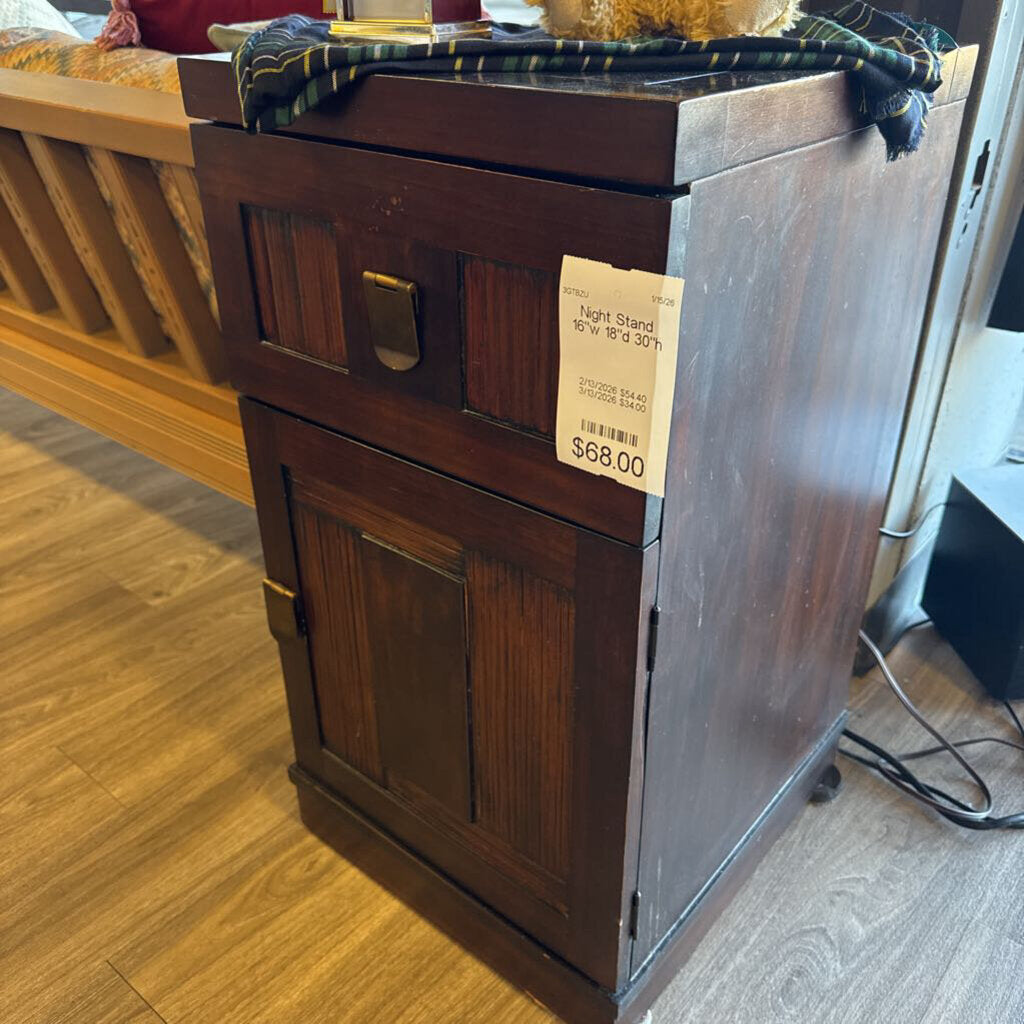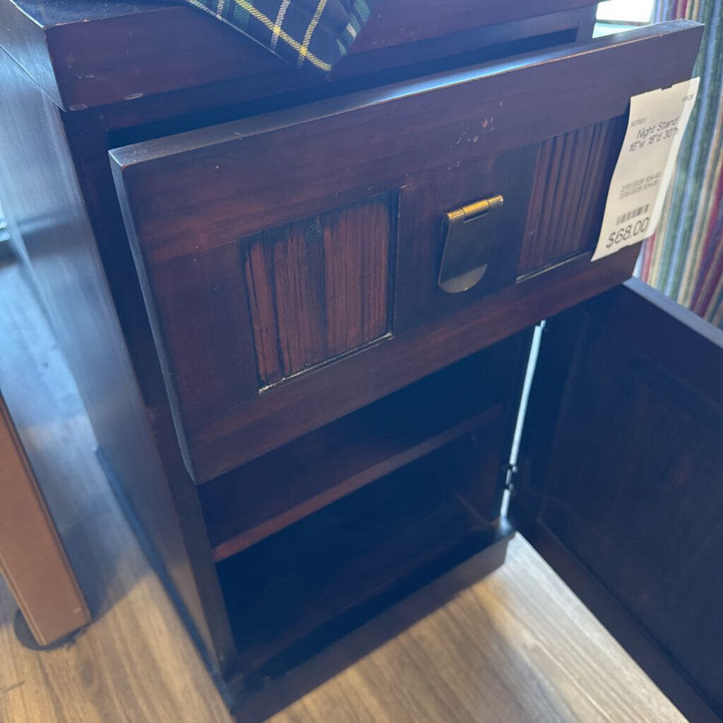 wood night stand mission style with metal pulls; one drawer and cabinet door over storage with shelf; can be wired for power