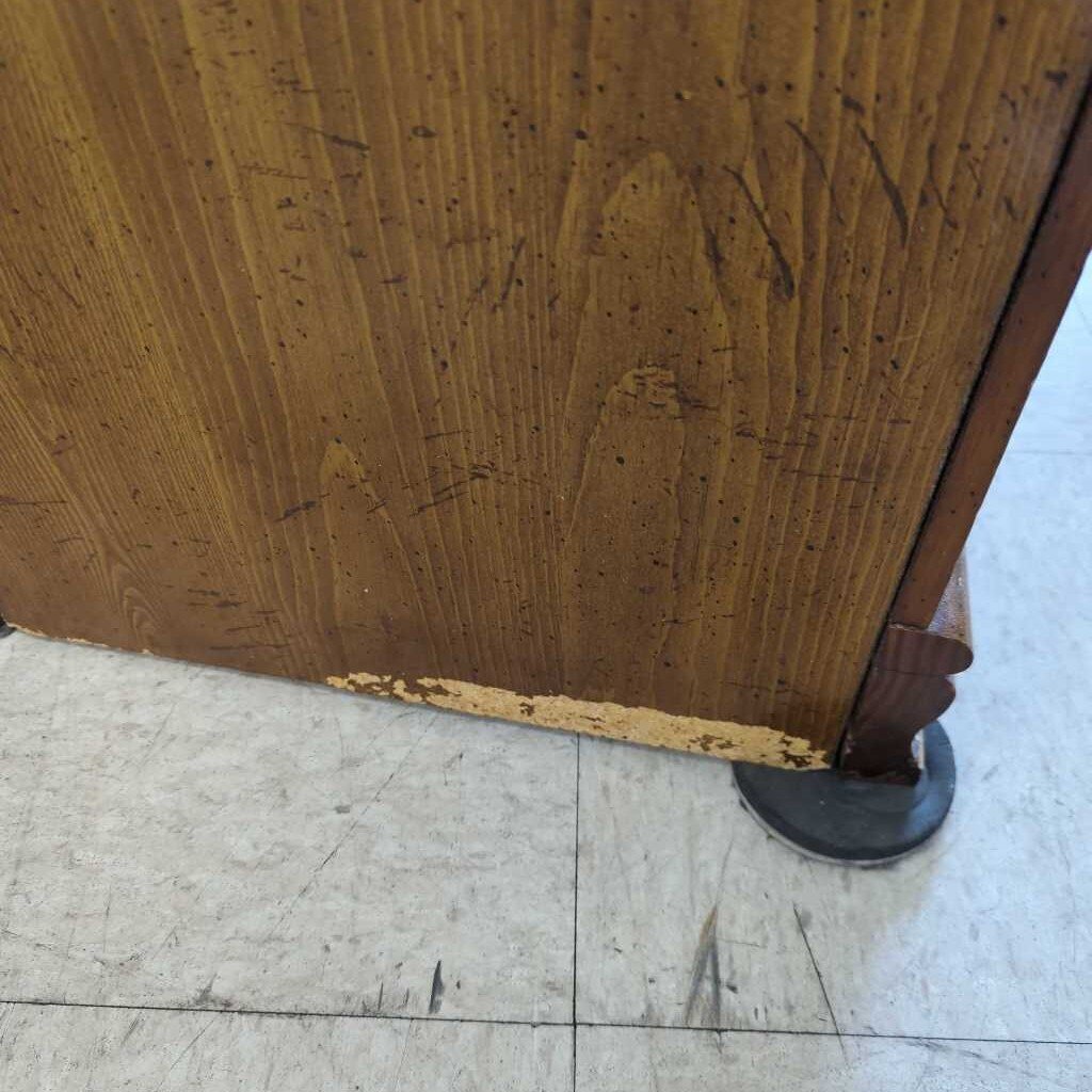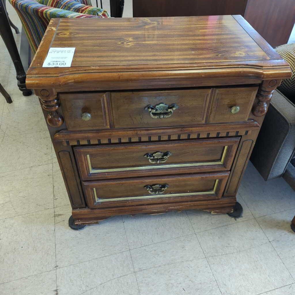 3 drawer nightstand with metal pulls and gold trim. Some damage to the bottom side.