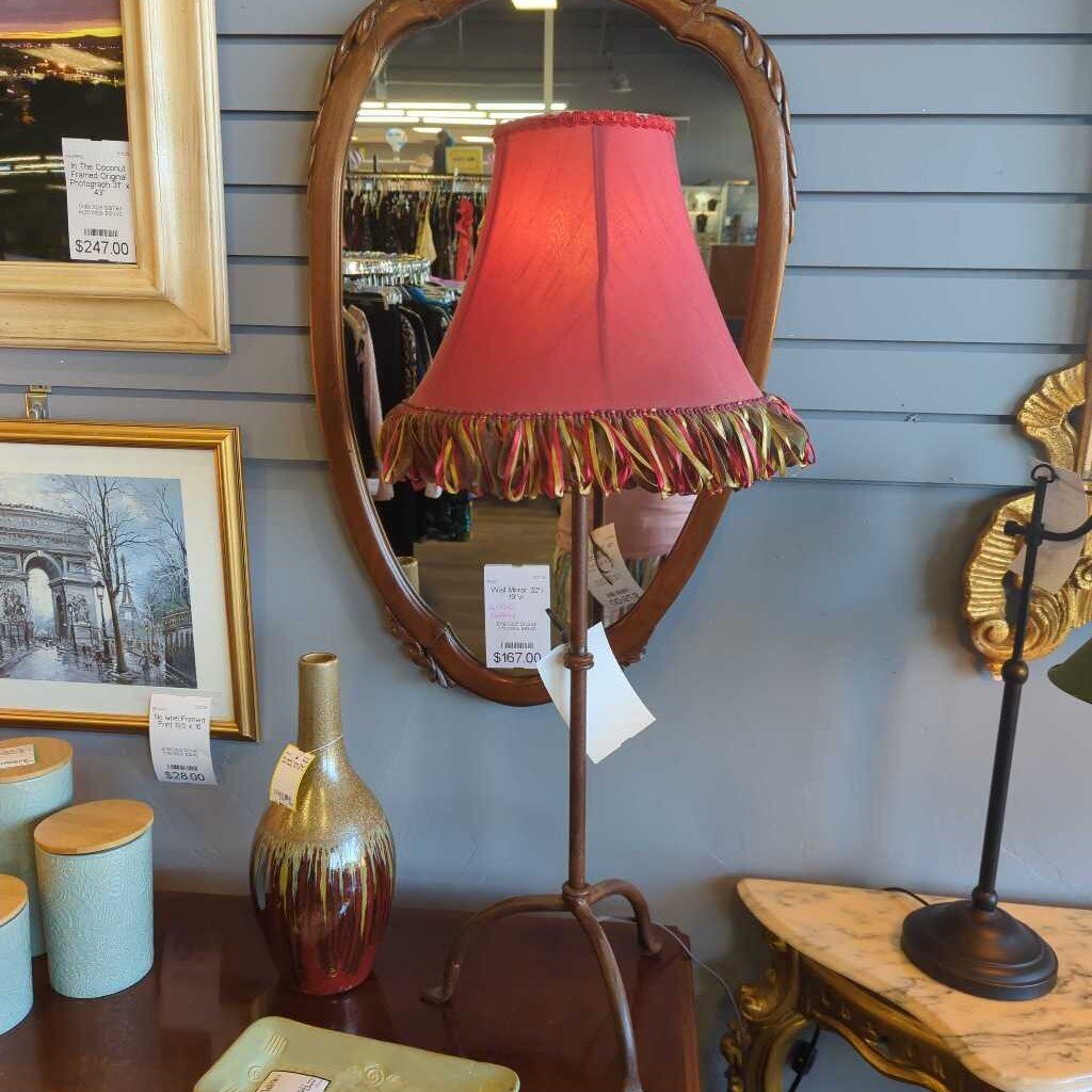 ORIGINALLY PRICED $79; Wrought iron body, three pronged feet, red lapshade with green and red ribbon fringe