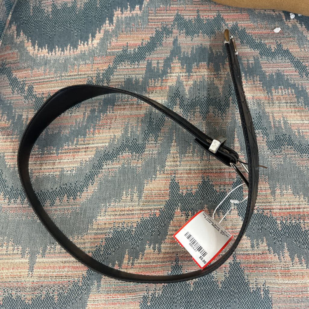 Black vegan embossed leather belt with silver buckle.