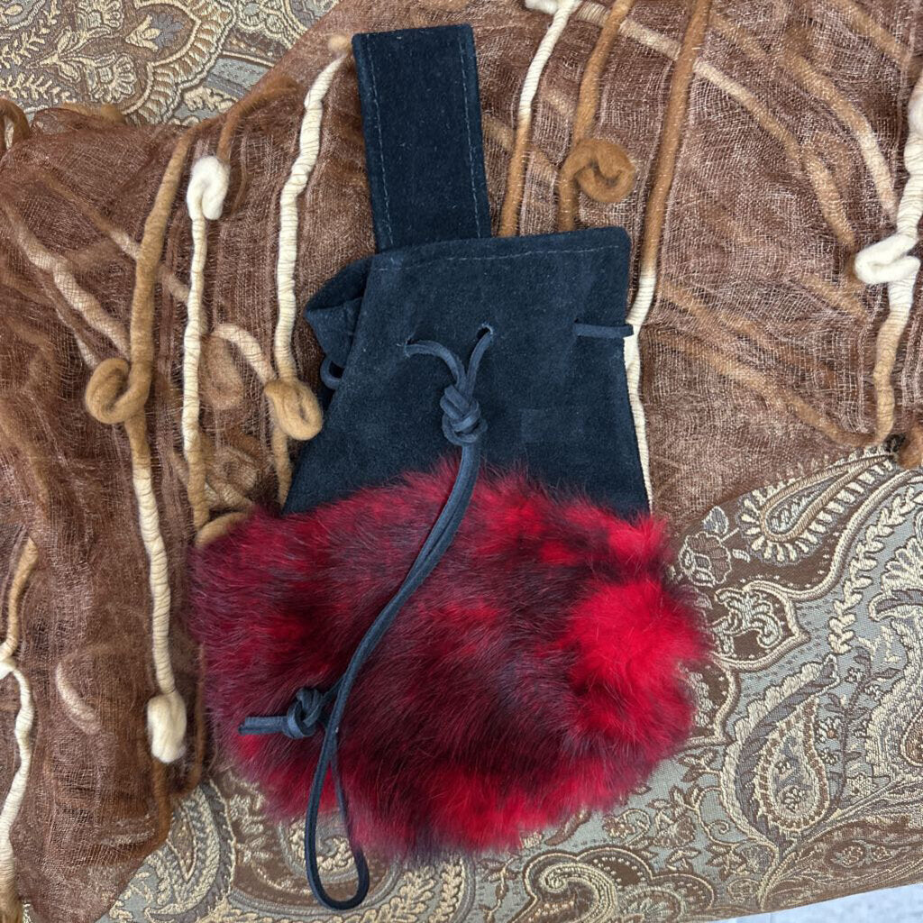 Black leather small belt bag with drawstring closure and contrast red rabbit fur.