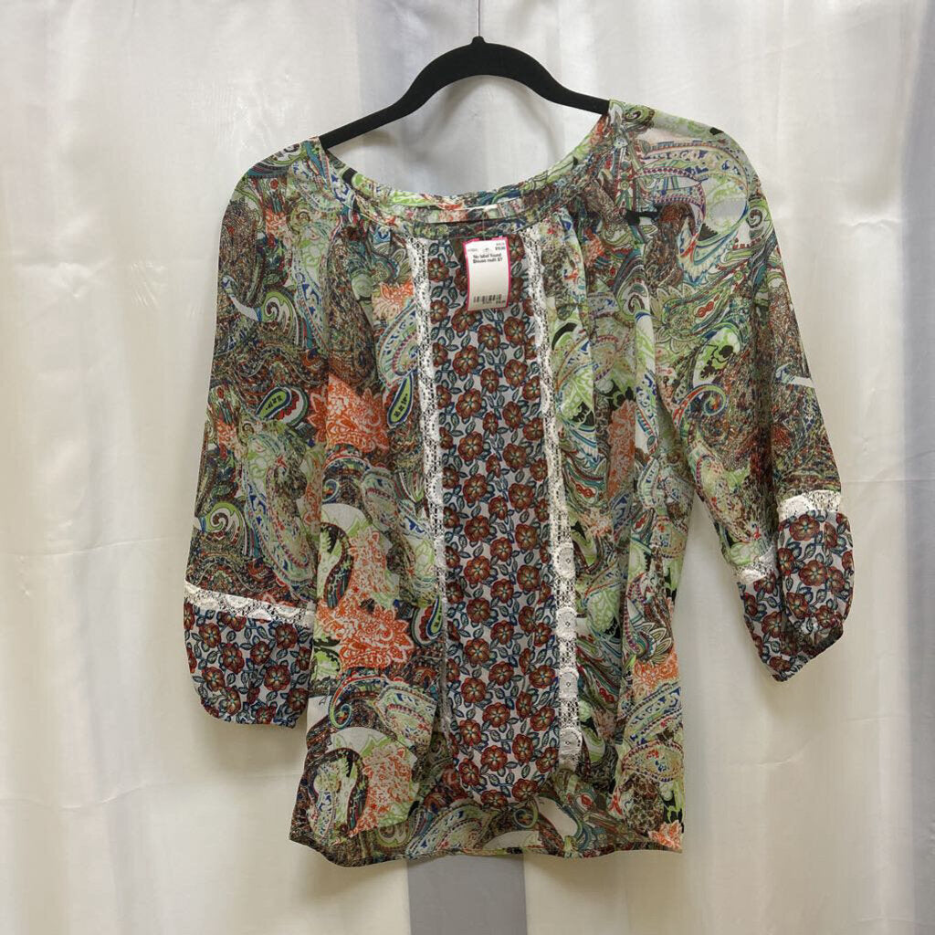 3/4 bell sleeve with lace accent, keyhole neckline. Floral/paisley combo design.