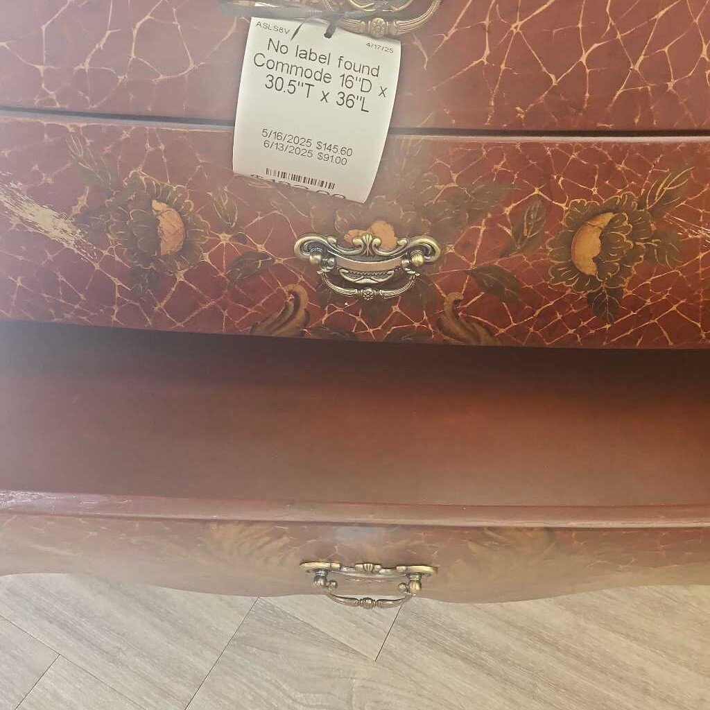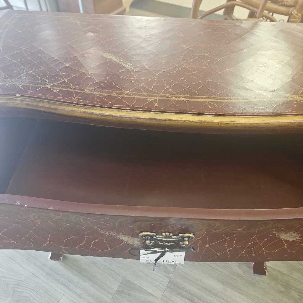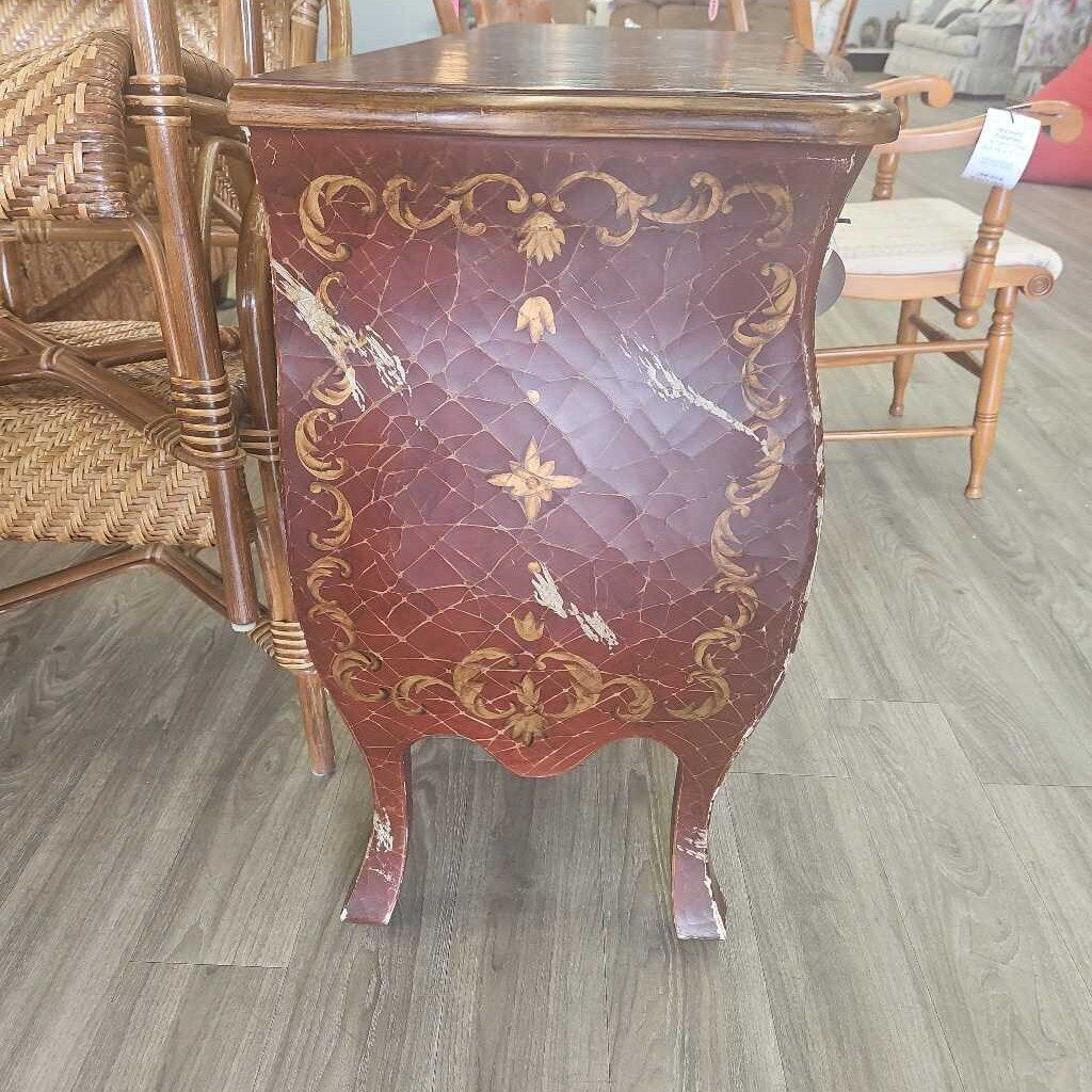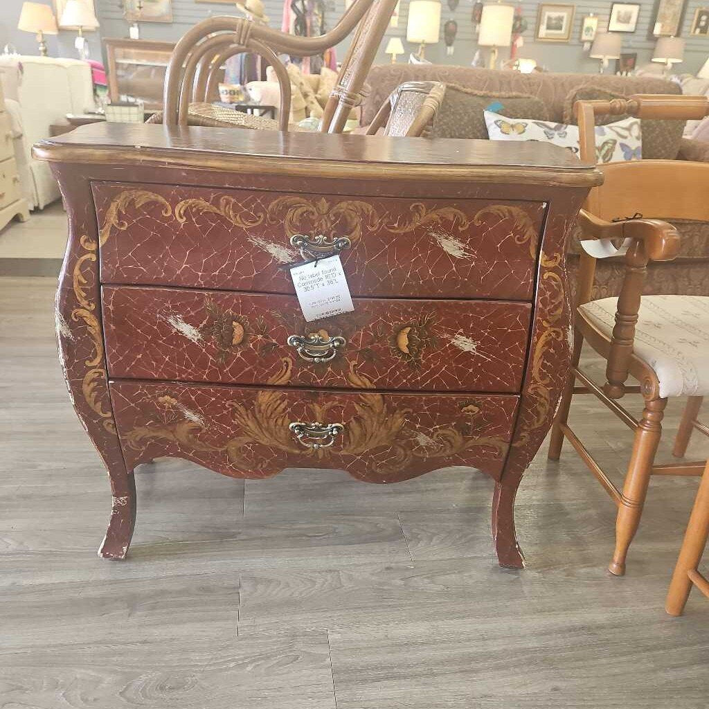 ORIGINALLY PRICED $182; Three drawers with metal pulls, crackled glaze and floral painted with gold tone embellishments. Beautiful piece.