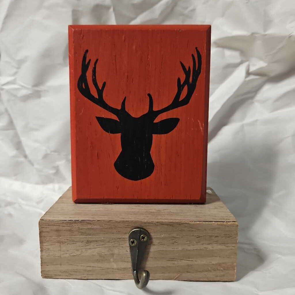 Wooden base, black elk design on red background.