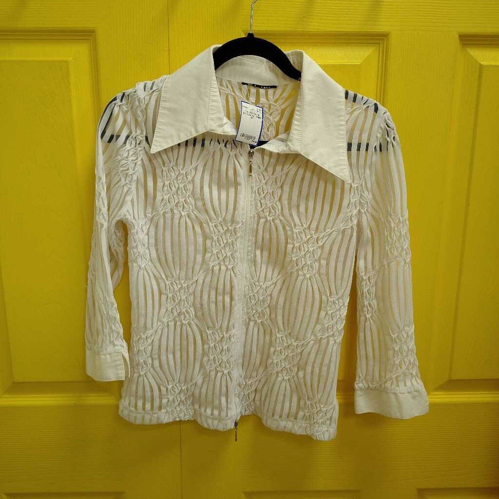 Zipper closure, collar, sheer with pattern throughout. 3/4 sleeves. Falls past waist! Cute!