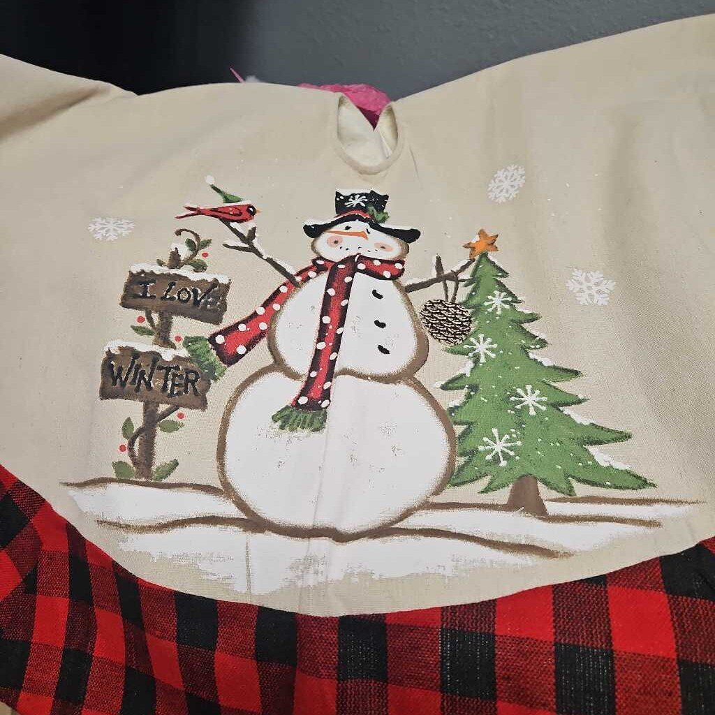 heavy fabric tree skirt with flannel red and black lining on edge and snowman.