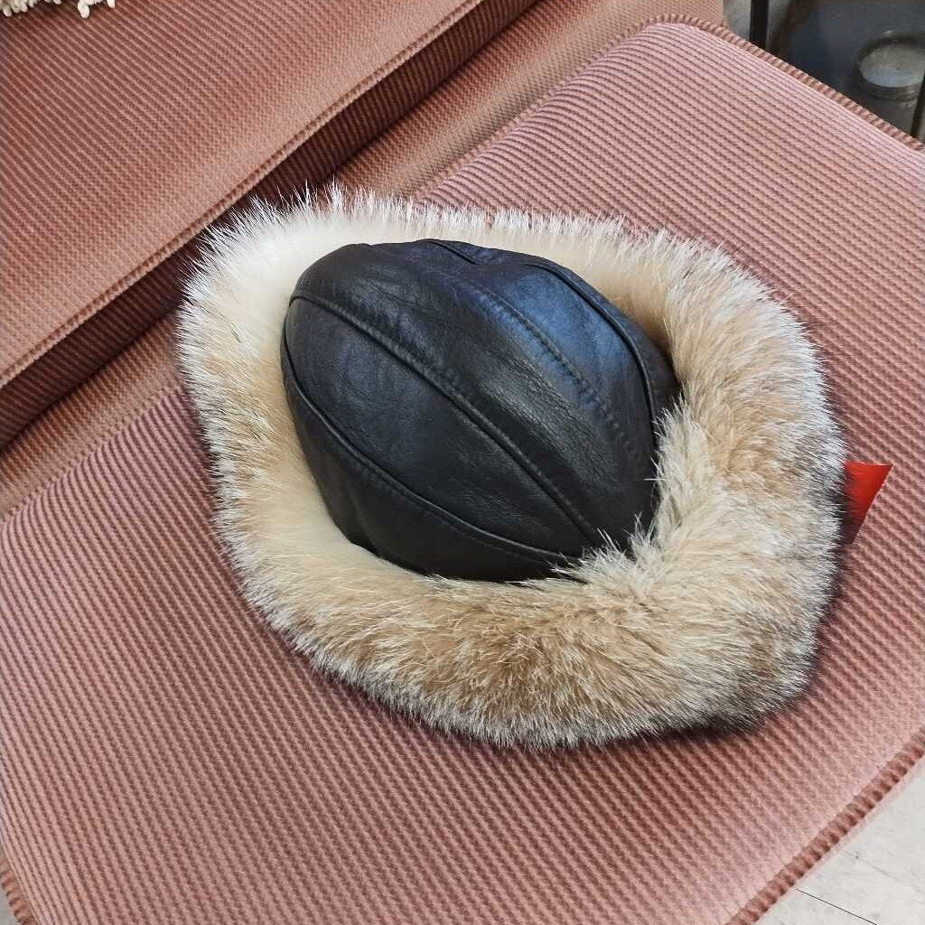 Russian style ushanka trapper hat with a brown leather crown and natural fox fur trim. Do Not Donate.