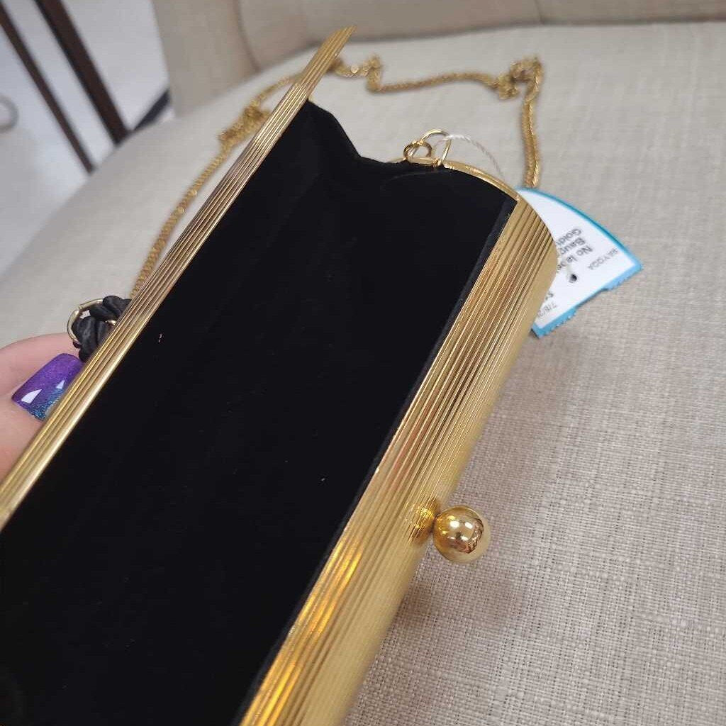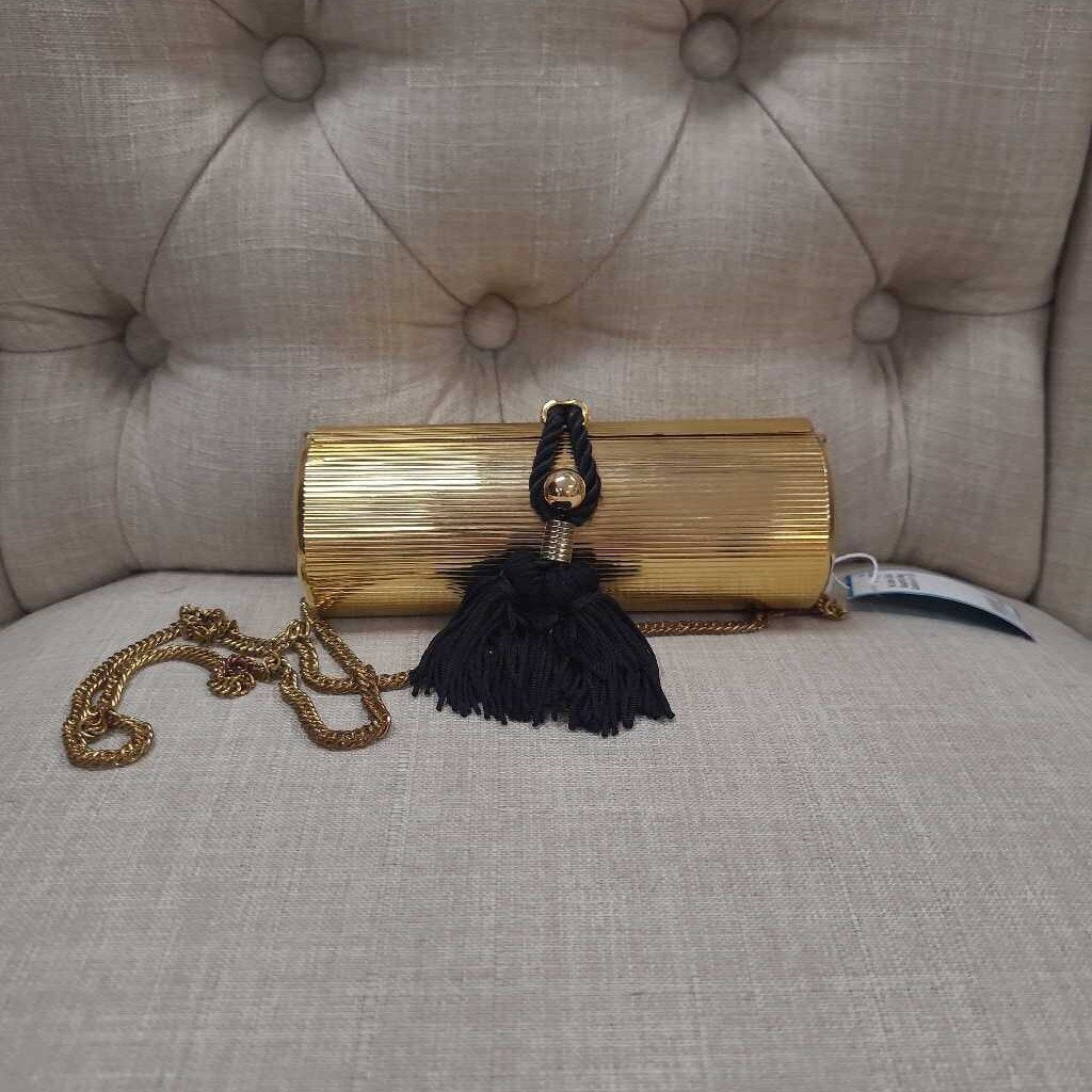 Long cylindrical goldtone small evening baugetter bag with gold chain strap, and black tassel accents.
